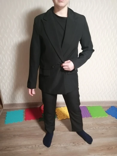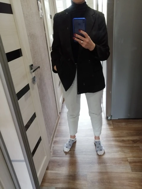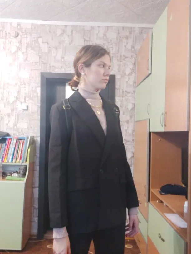 Хороший плотный пиджак, но прогадала с размером, на рост 162 L великоват: длиноват пиджак и рукава пришлось ушить, но в целом в плечах нормально, но пришлось снять подкладки, ибо они топорщились некрасиво. Берите свой размер, а не на размер больше, думаю все равно будет оверсайз. Думаю, за свою цену гораздо лучше чем пиджаки из масмаркета.