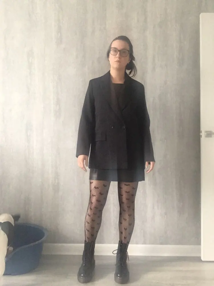 Ношу обычно xs, пиджак не то чтобы оверсайз, но это не было целью, ткань синтетика, чуть блестит на свету. На свою цену хороший пиджак.