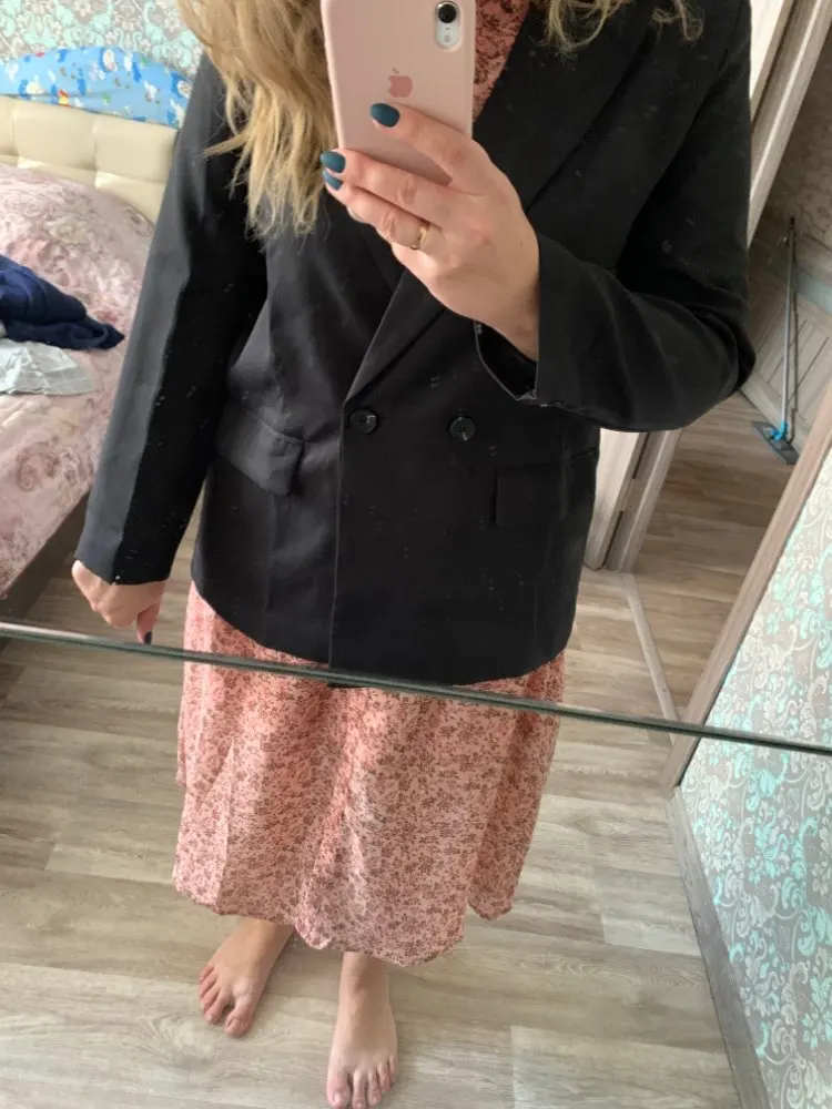 Хороший пиджак, топ за свои деньги. Ткань в целом приятная, торчащих ниток нет, разве что отпарить пришлось перед ноской. Взяла размер «M» и ни чуть не пожалела, на рост 163 сел как надо (специально хотела взять посвободнее). Были проблемы с доставкой, но это уже косяк Почты России. Заказом очень довольна :)