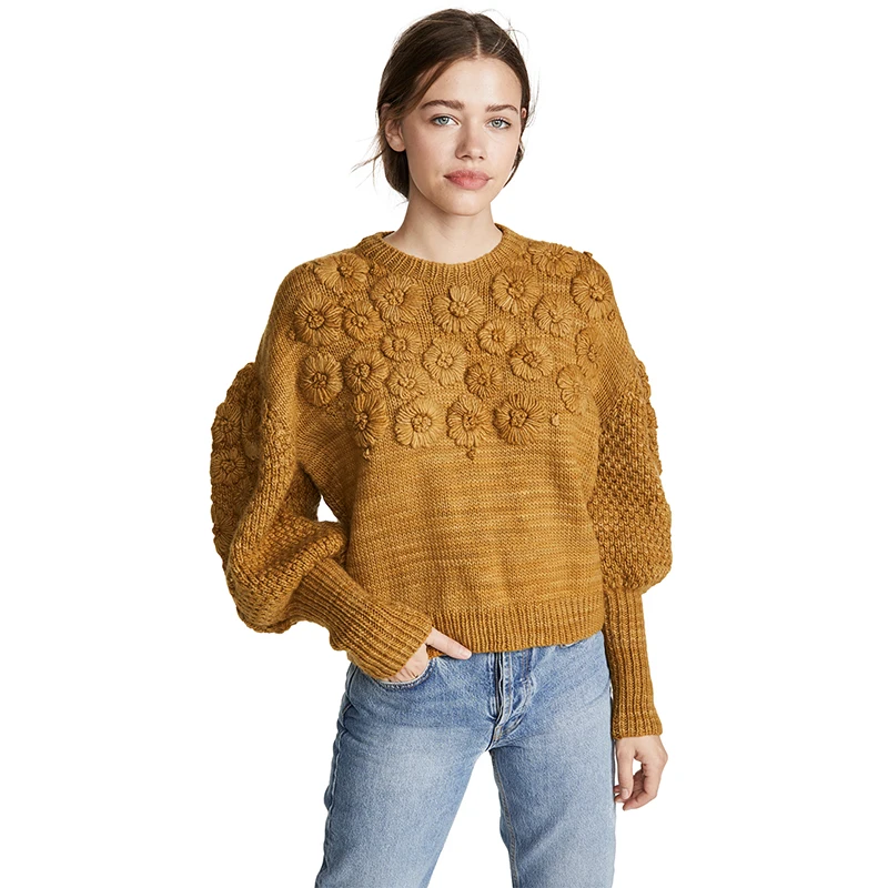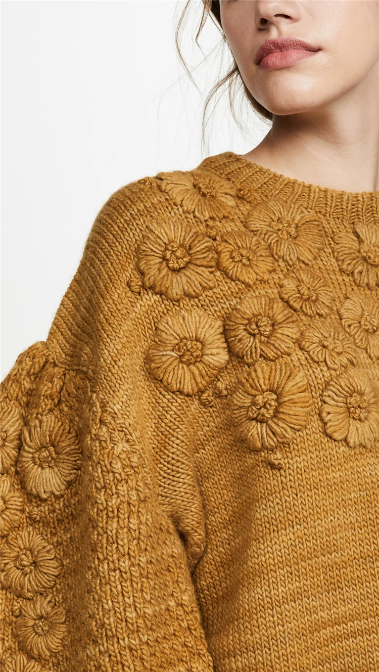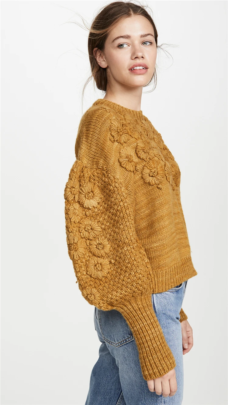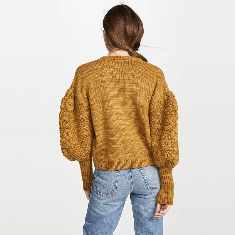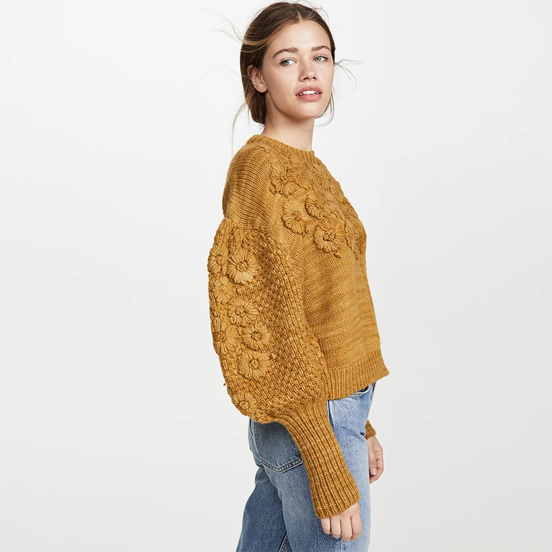 Осенне-зимний новый шерстяной свитер ручной работы с цветочным рисунком, Женский вязаный свитер с рукавами-фонариками