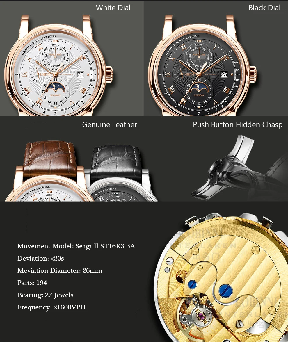 LOBINNI мужской роскошный бренд часов Moon Phase автоматические мех...