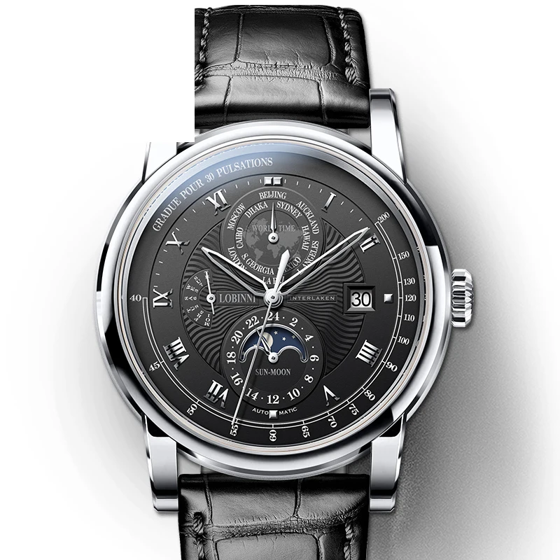 Швейцарские мужские часы LOBINNI, деловые автоматические механические мужские часы с сапфировым стеклом, мужские часы с надписью World Time