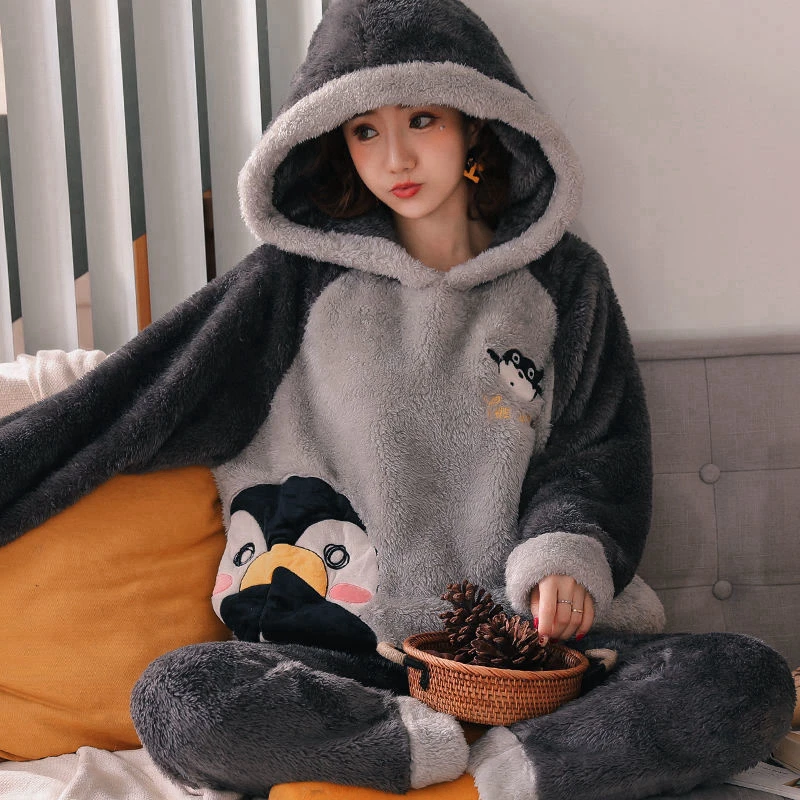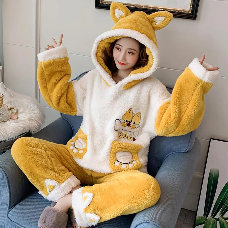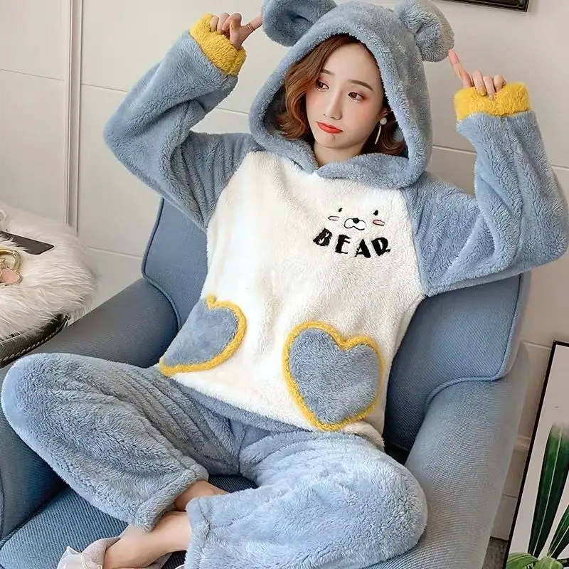 Женский пижамный комплект, женская пижама, толстая фланелевая Милая одежда с овечьей шерстью, женский теплый зимний пижамный комплект, ночное белье с длинным рукавом и мультяшным рисунком