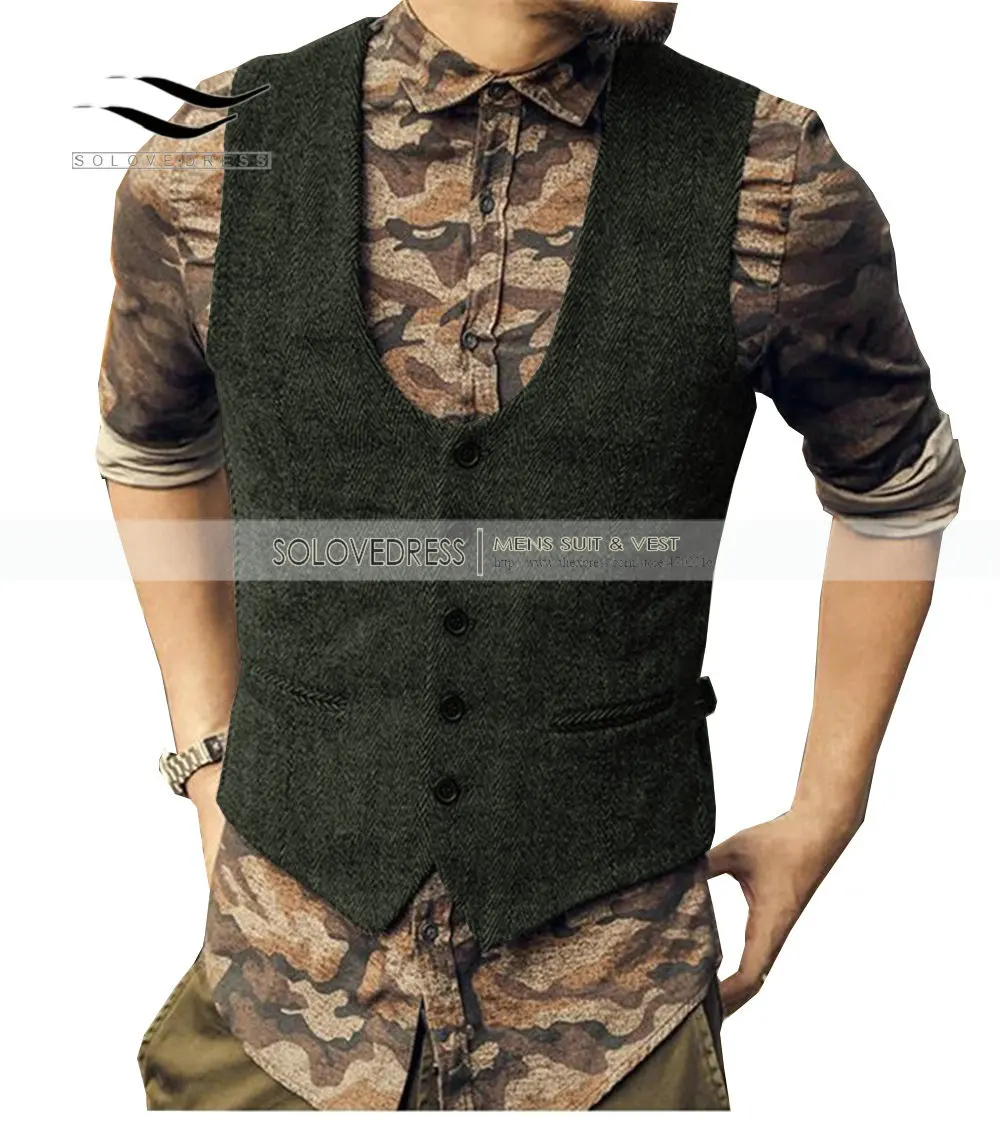 Серый мужской костюм жилет Slim Fit елочка твид U шеи для свадьбы женихов мужчин s жилет