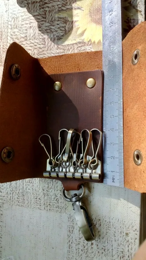 все відповідає опису. шкіра якісна, без стороннього запаху. легко вмістились 6 ключів. довгі ключі прийдеться чіпляти без карабіна на невелике кільце, щоб їх не було видно знизу. все супер. доставка 3 тижні. продавця рекомендую!!!!