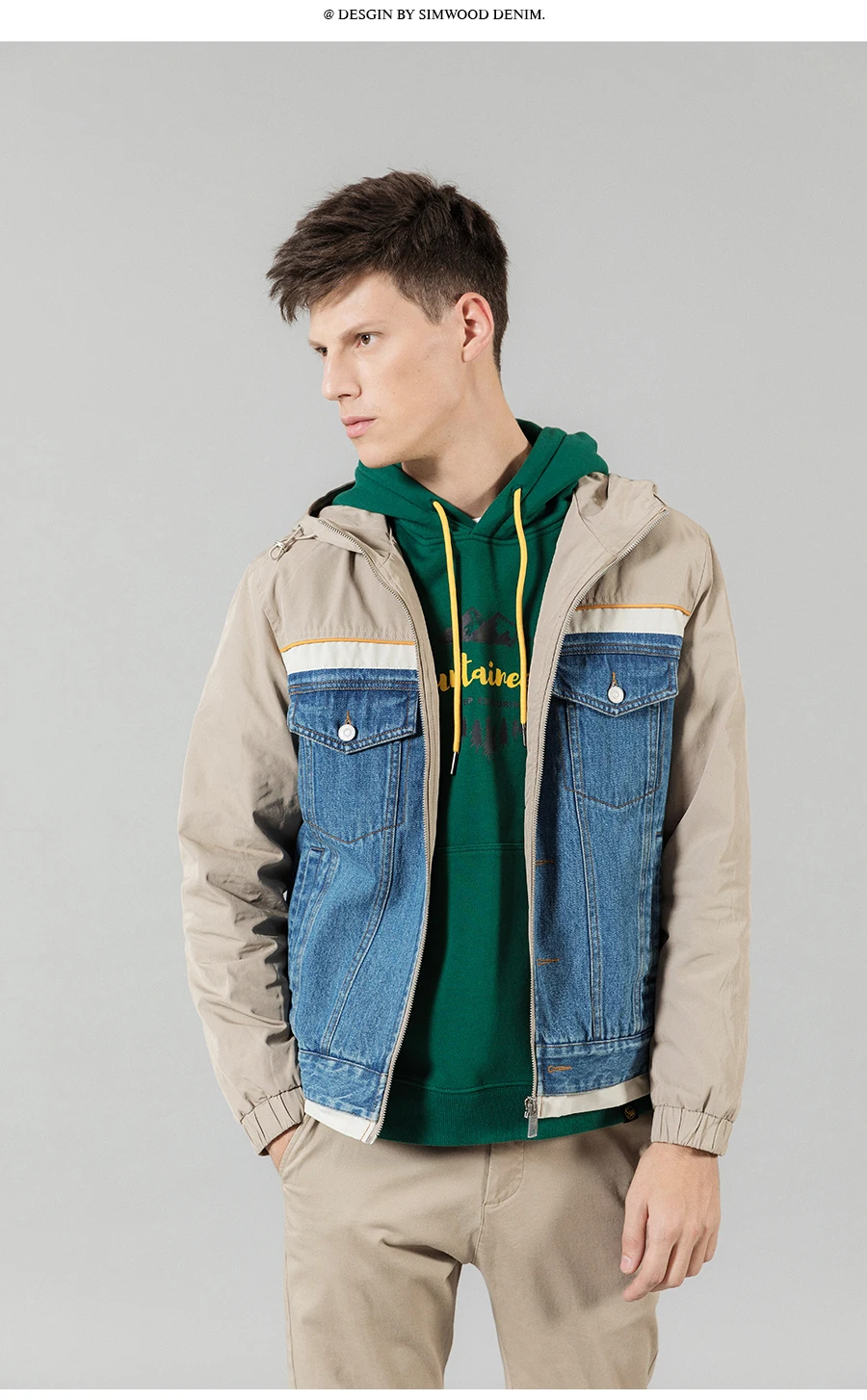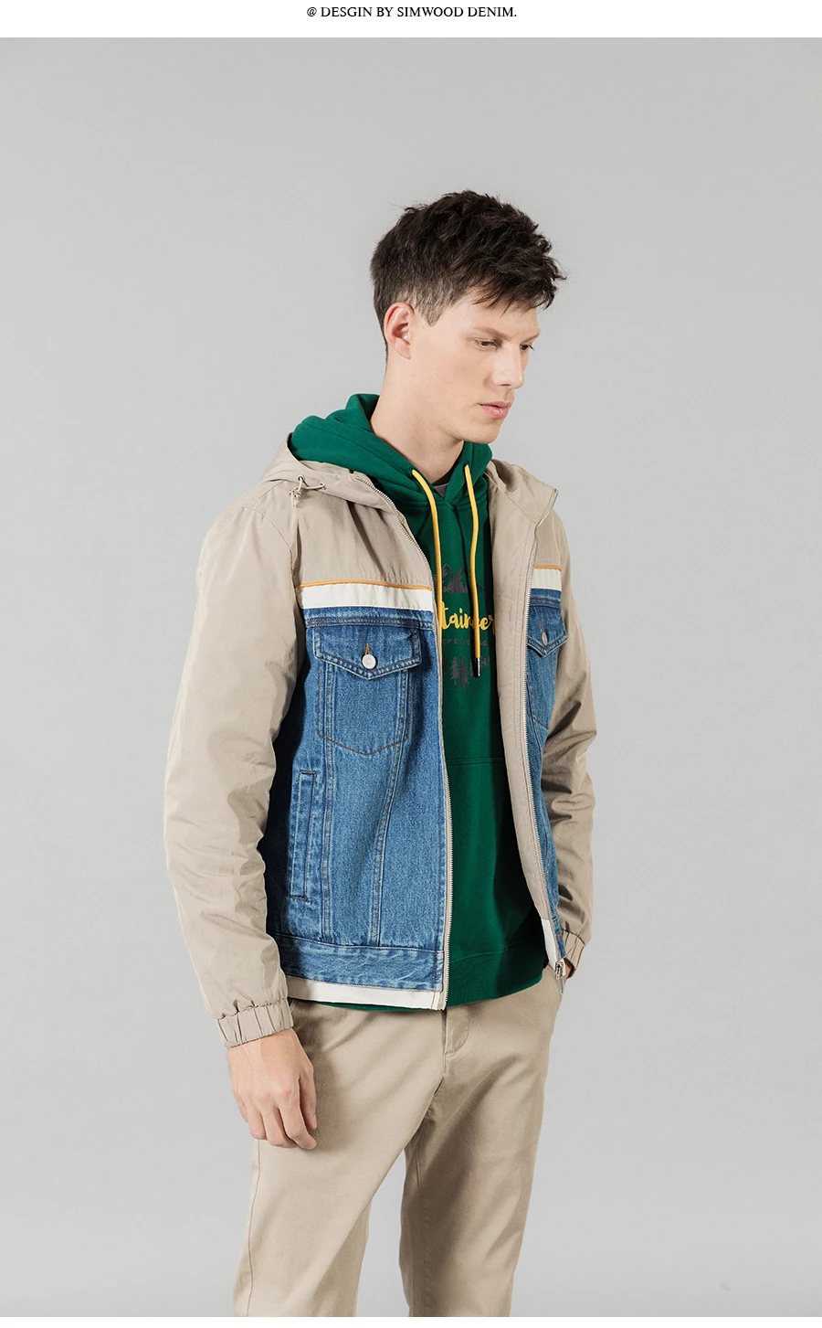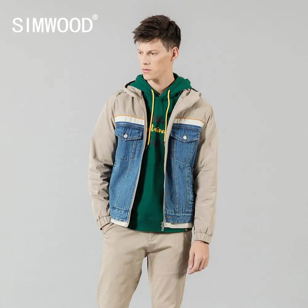Мужская джинсовая куртка SIMWOOD, куртка с капюшоном и вставками контрастных цветов, уличная одежда в стиле хип-хоп, лоскутное пальто, брендовая одежда SI980536, Осень-зима 2019