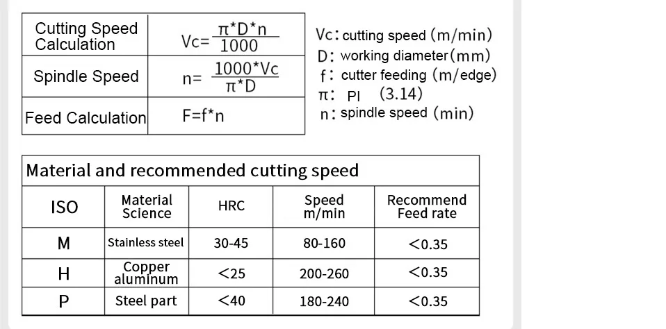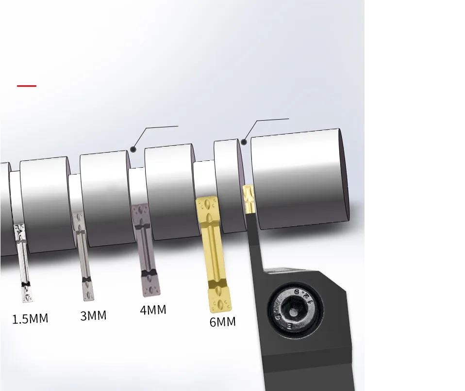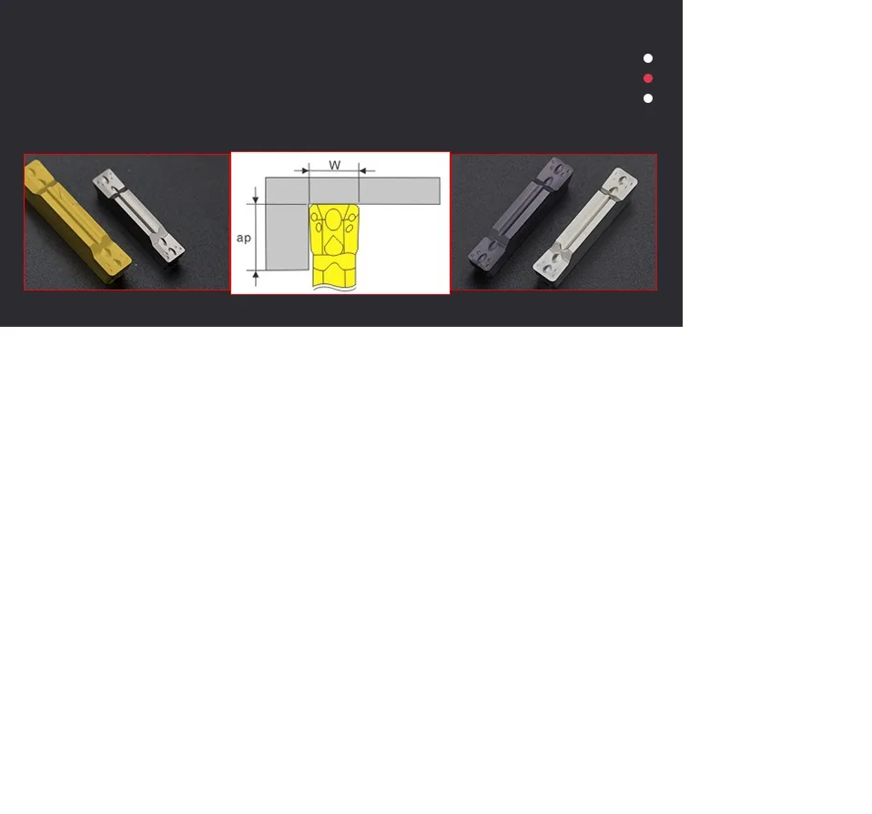 ①Параметры спецификации вставки и Производительность станка должны рассматриваться (Fmax = wx0.075).②Скорость подачи не должна превышать радиус угла вставки.③В процессе обработки канавок проблема удаления чипов может быть решена с помощью небольшой глубины резки и пошаговой обработки.