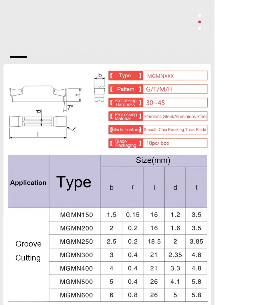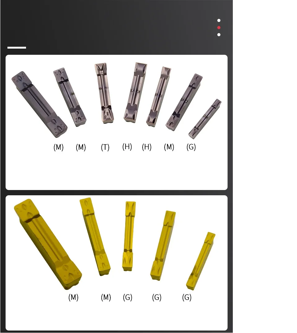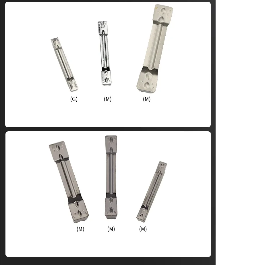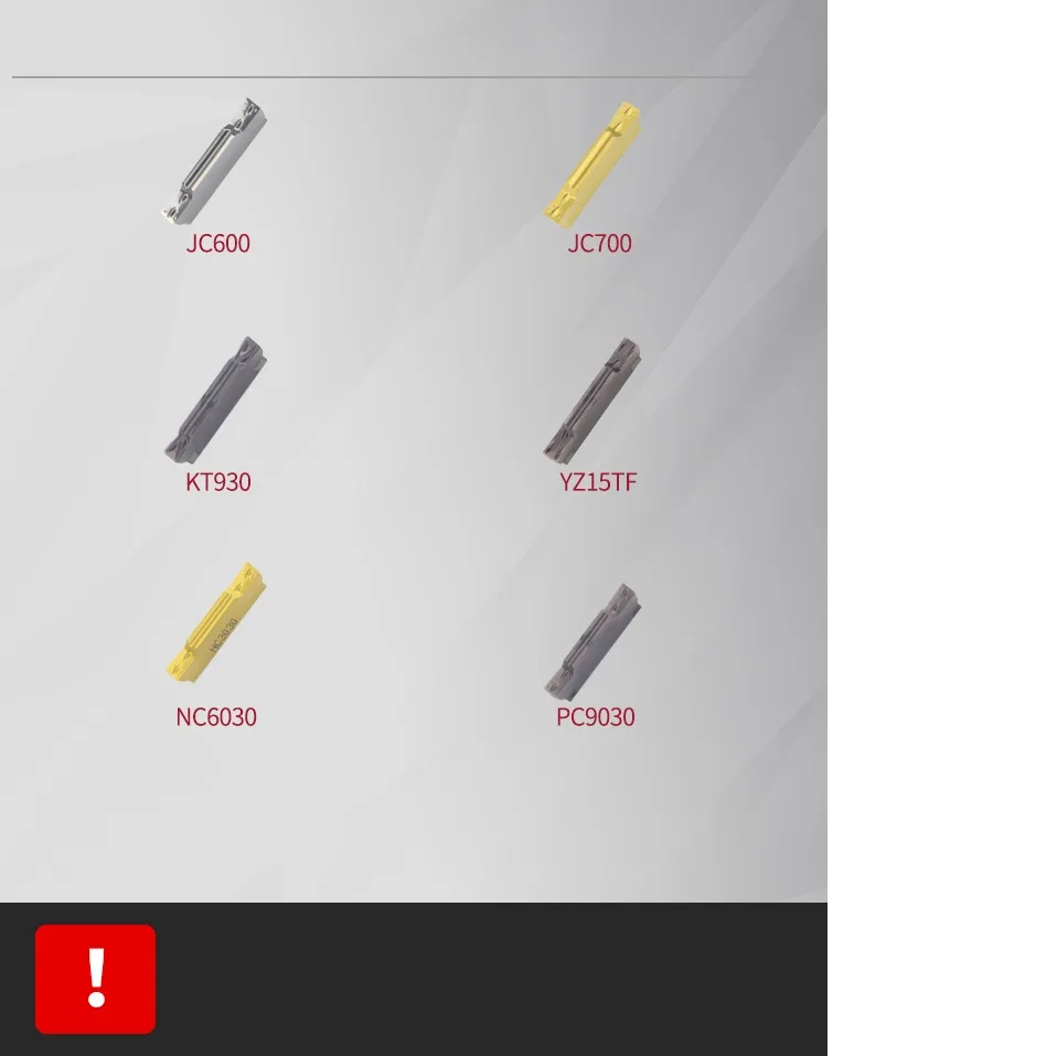 JC700: обновленная версия JC600, используется для обработки стальных деталейKT930: используется для обработки нержавеющей сталиKT1505: используется для обработки стали и нержавеющей сталиKT60: керамическое лезвие, используется для обработки мягкой сталиH01: используется для обработки алюминиевых деталейYZ6020: хорошая прочность, используется для обработки стальных деталей ниже 40 градусовYZ15TF: используется для обработки нержавеющей стали и уменьшения поломки инструмента.YZ5115: улучшенная версия, хорошая прочность, используется для обработки чугуна.NC3030: используется для обработки стальных деталей. Уменьшает трение и давление резки.PC9030: используется для обработки нержавеющей стали. Высокая точность и твердость.H05: высококачественные материалы для обработки алюминиевых и медных деталей.MGMN-G/M/H/T:-G: Тип паза отделки. С сильной способностью удаления чипа.-M: универсальный тип паза, может быть обработан как мелким, так и грубым.-T: грубая обработка типа паза, не легко приклеивать нож.