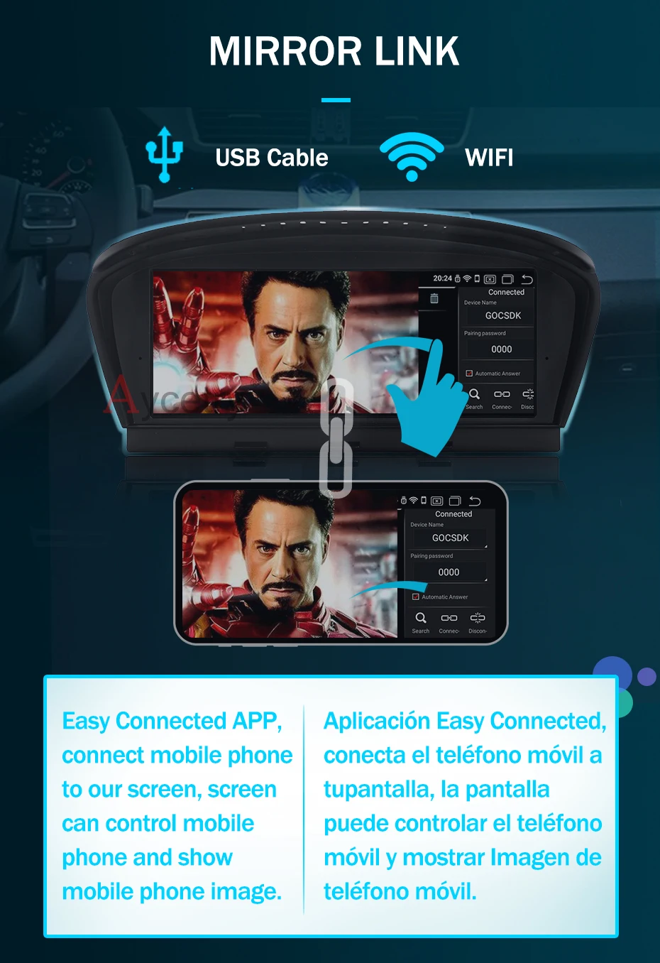 Подключите ваш мобильный телефон к этому радио с помощью функции зеркальной связи, радиоэкран покажет мобильный телефон, как зеркало. И радио может управлять ваш мобильный телефон, так что вы можете слушать мобильный телефон музыку или совершать звонки через Радио экран после их подключения.