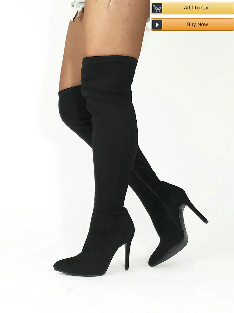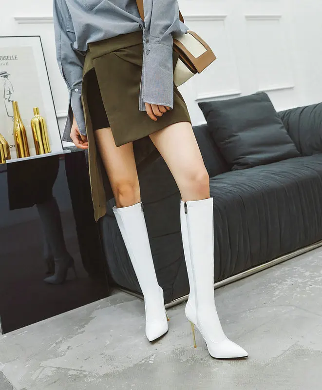 Сапоги по колено на высоком каблуке с закрытым острым носком и боковой молнией