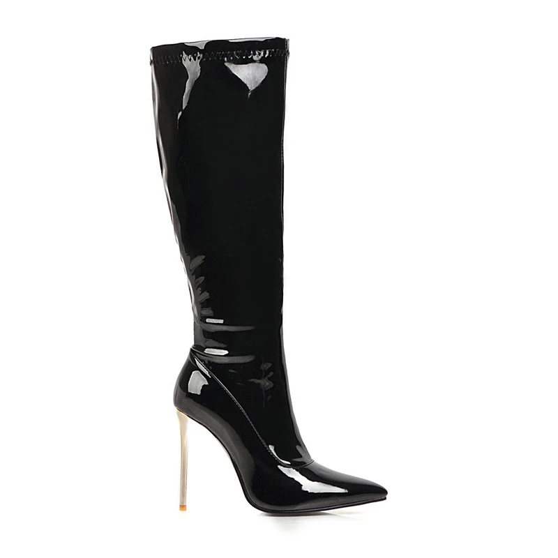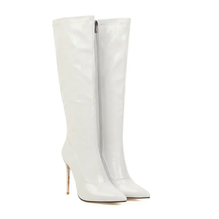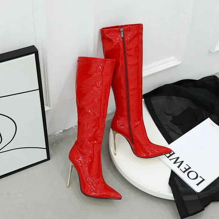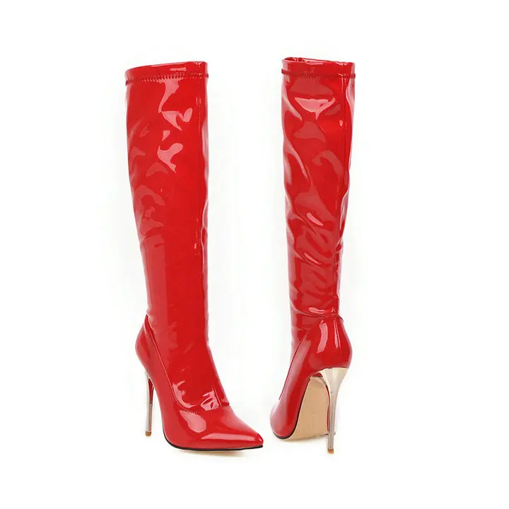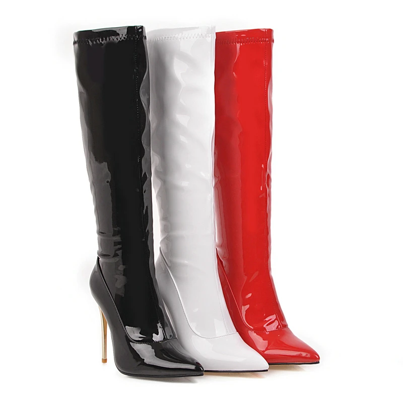 Черные, красные, белые Лакированные кожаные привлекательные сапоги до колена на очень высоком каблуке женские высокие сапоги с острым носком зимние классические сапоги с боковой молнией 2019