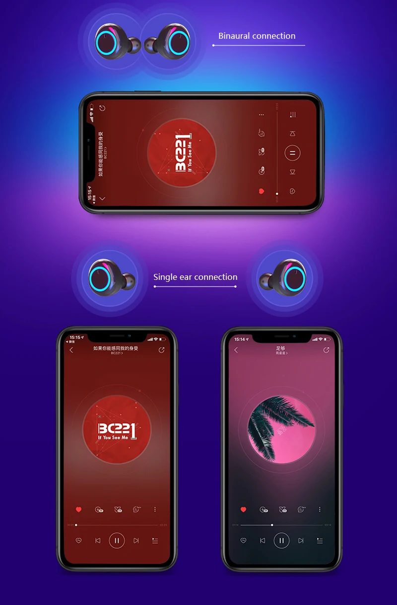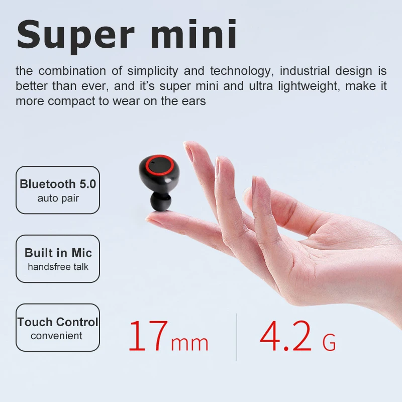 Характеристики продукта: 1). Bluetooth 5,0, низкое энергопотребление, более стабильный сигнал, отличная совместимость с bluetooth, Совместимость со всеми смартфонами, Планшетными ПК и т. Д. 2). Автоматическая пара, Автоматическое включение/выключение питания: когда извлеките гарнитуру из зарядного устройства, две гарнитуры включатся автоматически и соединяются друг с другом автоматически. Когда вы поместите гарнитуру обратно в зарядное устройство, она автоматически выключится. 3). Умное сенсорное управление, просто касание пальца может обеспечить несколько функций, в том числе: воспроизведение и пауза, ответ и отклонение телефонного звонка, обратный вызов, воспроизведение следующей песни. Избавьтесь от традиционного управления кнопками, просто и удобно. 4). Каждый наушник встроен в литиевый аккумулятор 50 мАч, время воспроизведения музыки до 4 часов. Зарядное устройство встроено в аккумулятор 300 мАч, может заряжать наушники около 6 раз, очень долгое время ожидания. 5). IPX6 Водонепроницаемый и устойчивый к поту дизайн, вы можете носить его во время дождя, можно носить его, когда принимаете душ (но не кладите его в горячую воду), наслаждайтесь фитнесом с большим количеством пота. 6). Встроенный микрофон, может отвечать на телефонные звонки и общаться. 7). Эргономичный дизайн, супер мини, ультра легкий, подходит для ушей очень удобно, не давит на уши.