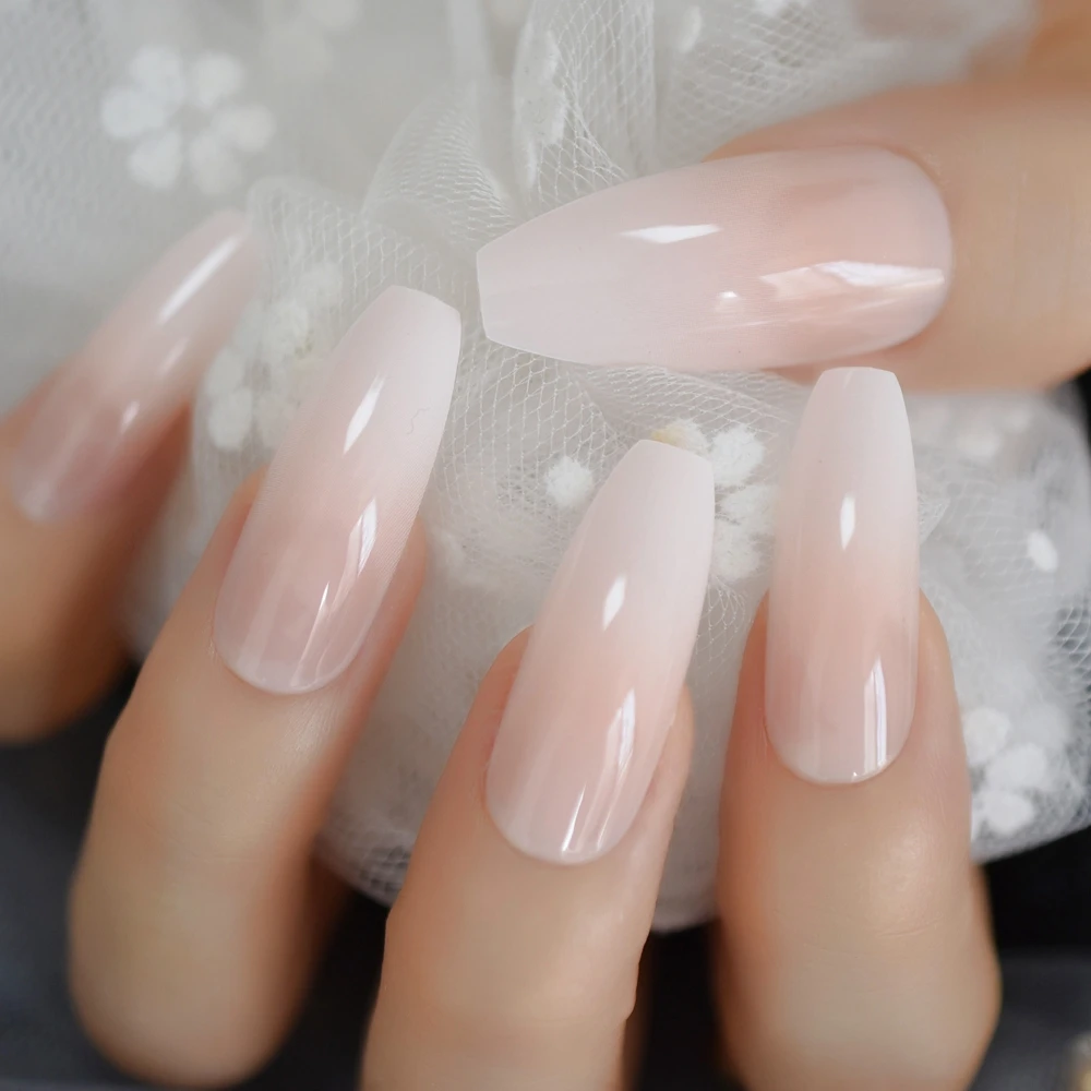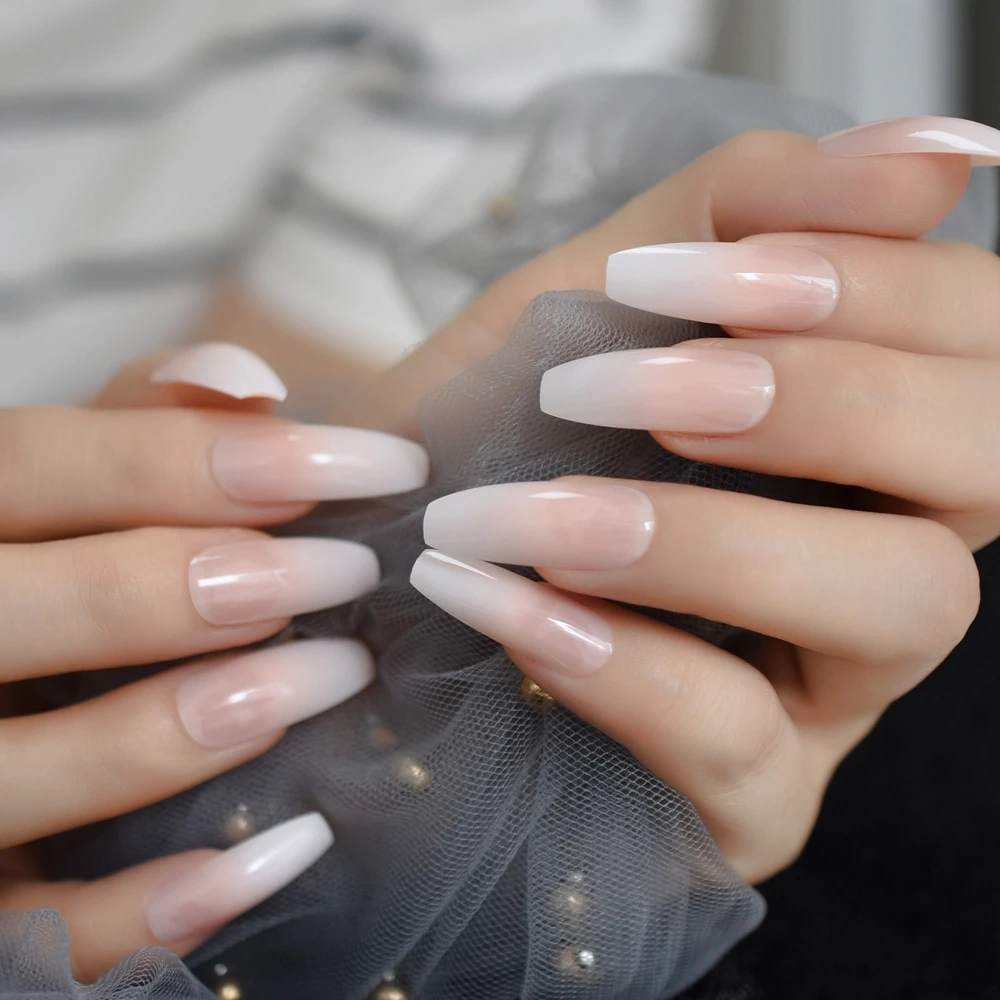 Омбре французский наконечник очень длинные балерины в форме ложных нажатий на натуральные ногти белый градиент телесный гроб Типсы с клейкими вкладками 24