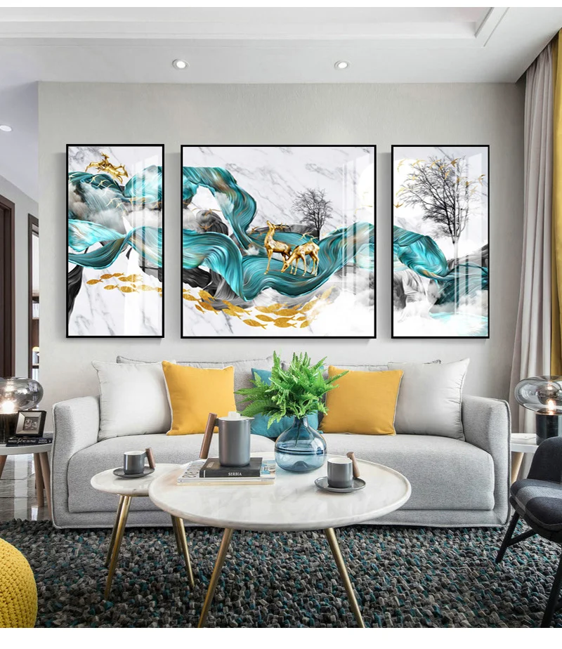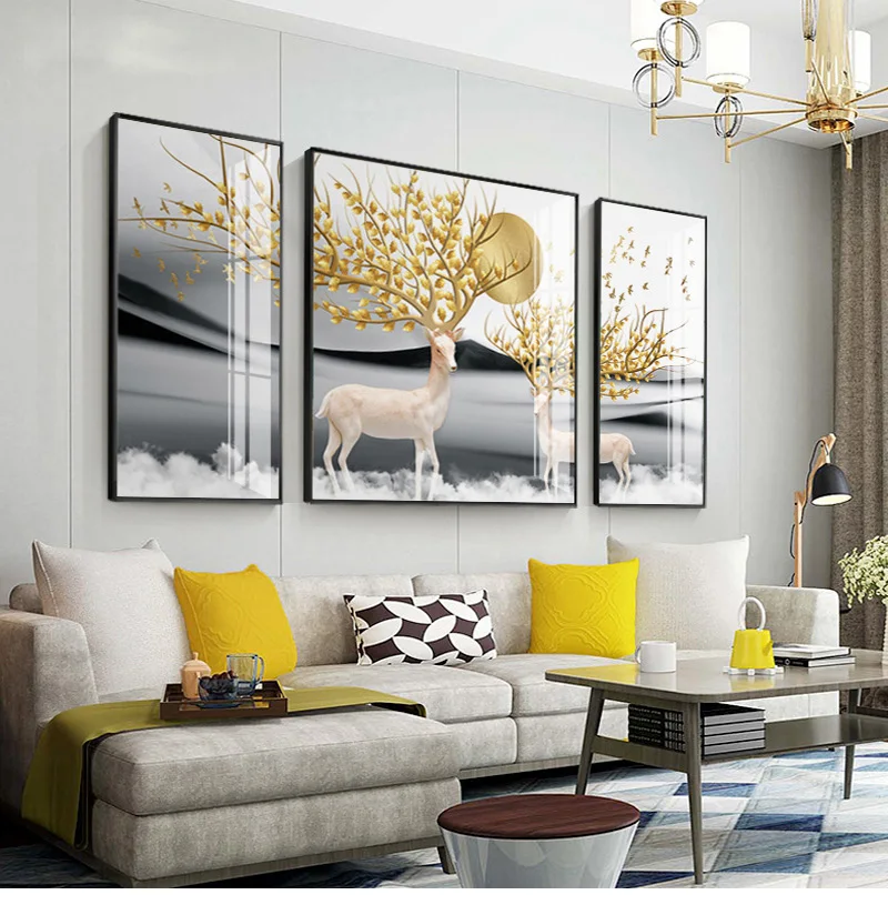 Современная Простота абстрактный китайский стиль Золотой олень и синий Дамаск и золотой солнце крыльцо украшение для гостиной холст искусство