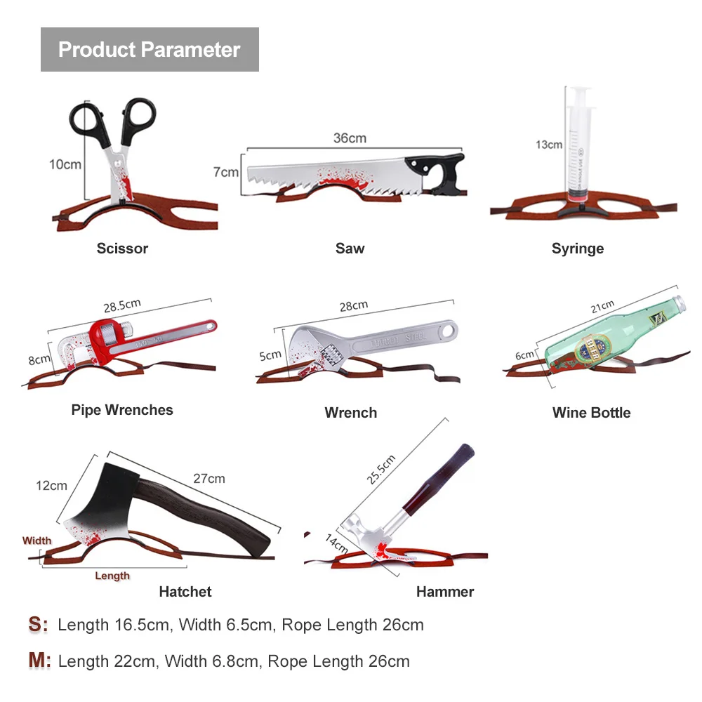 Стиль: топор/ножницы/пила Материал: пластик + фетровая ткань Случаи: Хэллоуин/Рождество/вечерние/смешной реквизит для фотографий Размер повязки ↓ S: длина 16,5 см, ширина 6,5 см, длина веревки 26 см М: длина 22 см, ширина 6,8 см, длина веревки 26 см Пожалуйста, помогите проверить размер перед покупкой.
