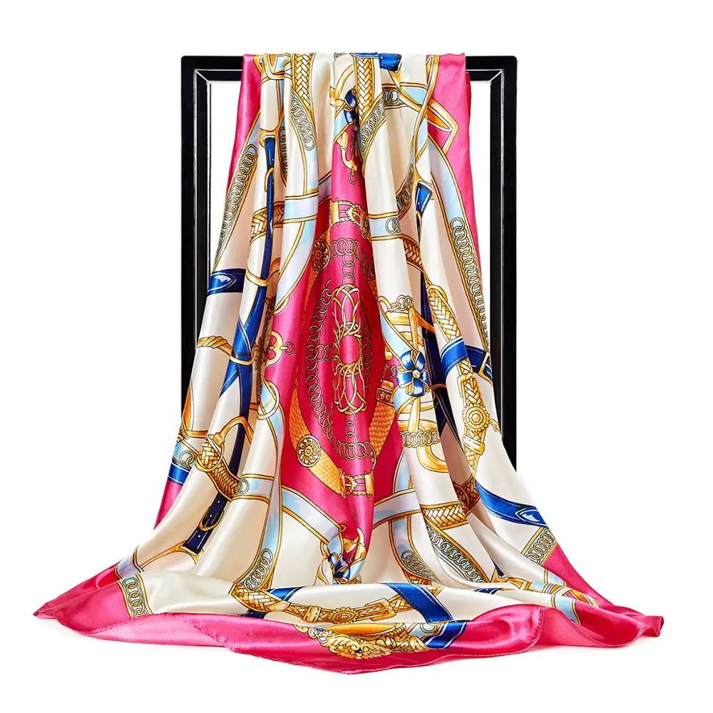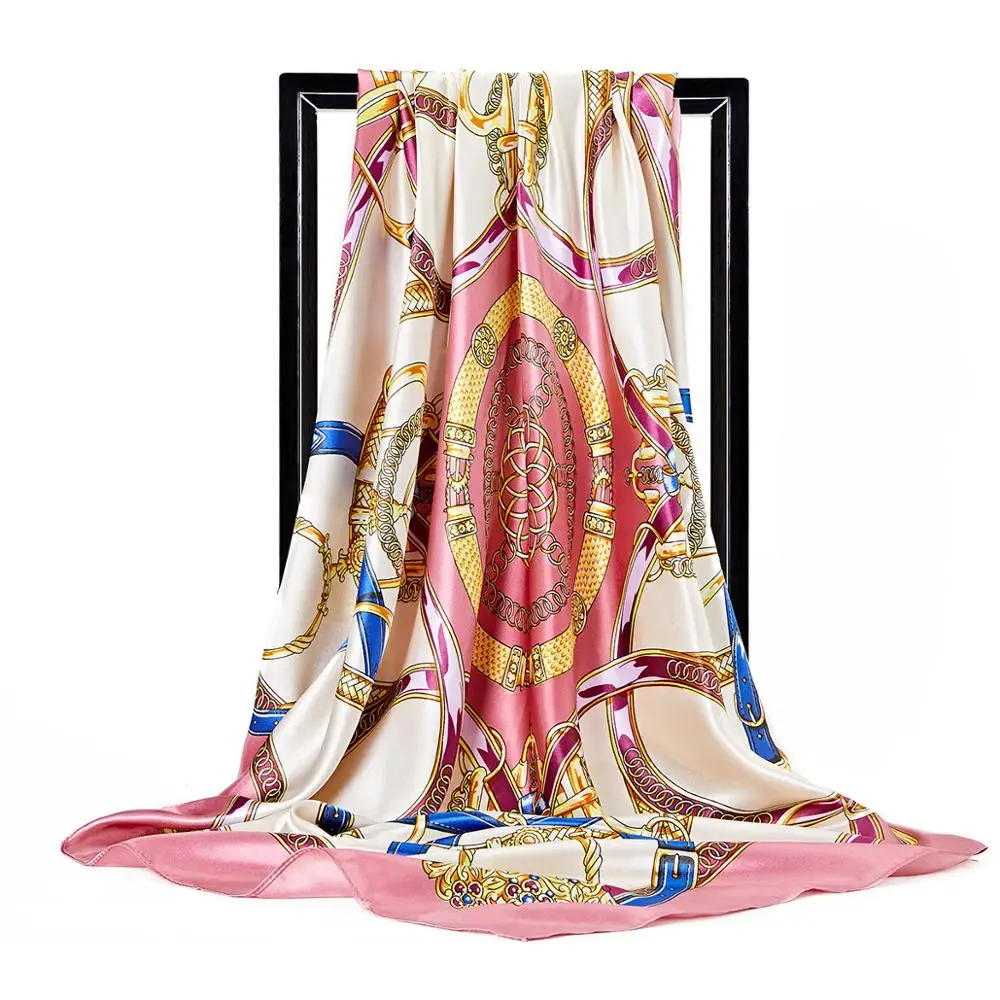 Роскошные шелковые шарфы для женщин цепочка с буквенным принтом платок атласный квадратный головной платок хиджаб шарфы для женщин брендовые шали 90*90 бандана женский шарф