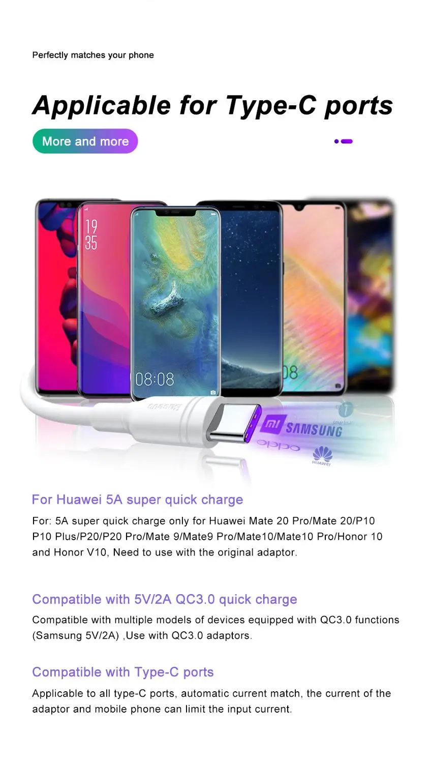 5 шт. 5A USB Type C кабель для быстрой зарядки Type-C Kable для Hua...