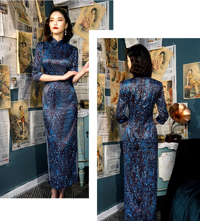 Sheng Coco Элегантное синее платье Qipao, китайский длинный Шелковы...
