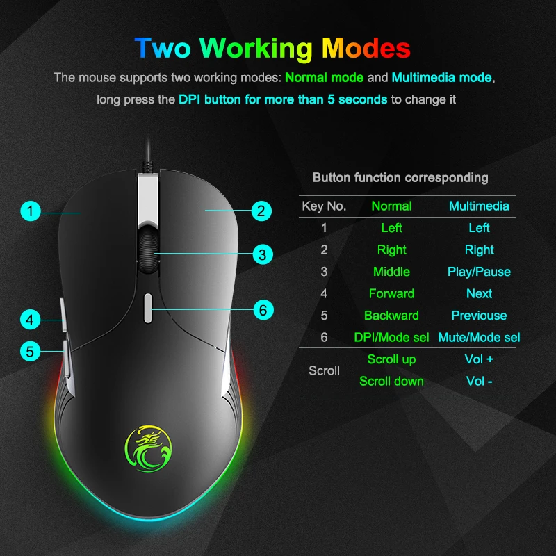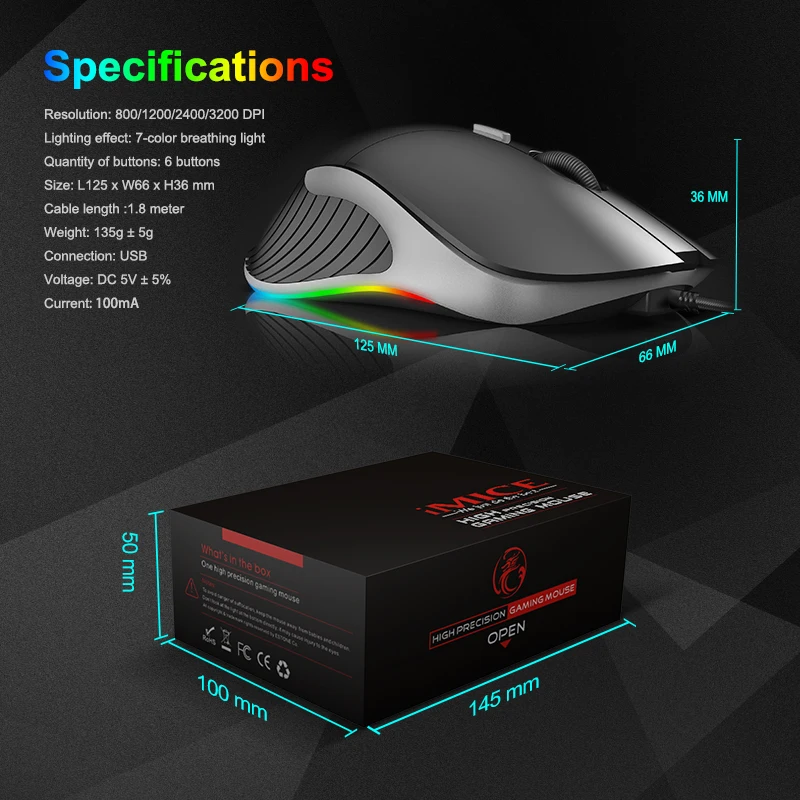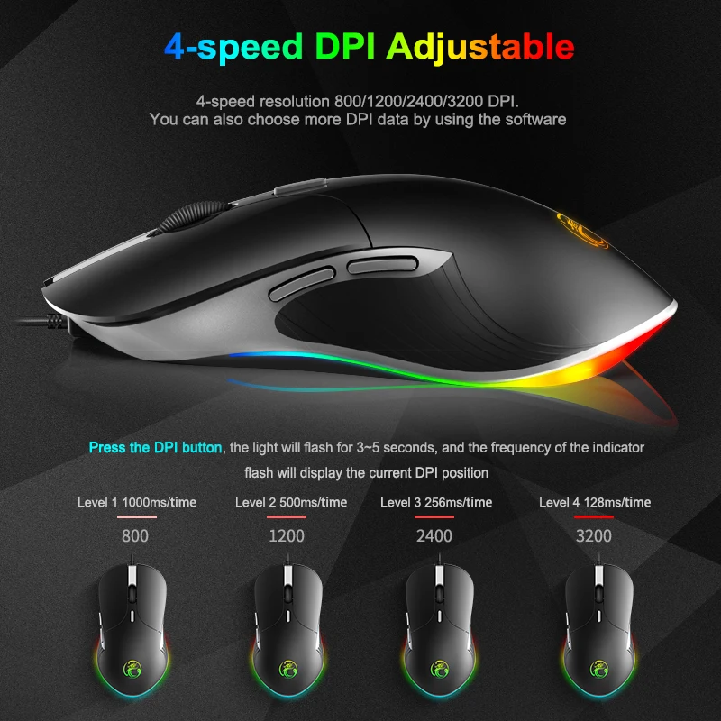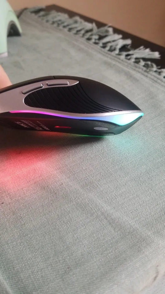 Мышь RGB всегда включена. Режим радуги. Нажмите кнопку DPI, мышь загорается с определенного цвета для выбранного DPI, а затем снова возвращается к радуге. Все в целом, достаточно хорошо.