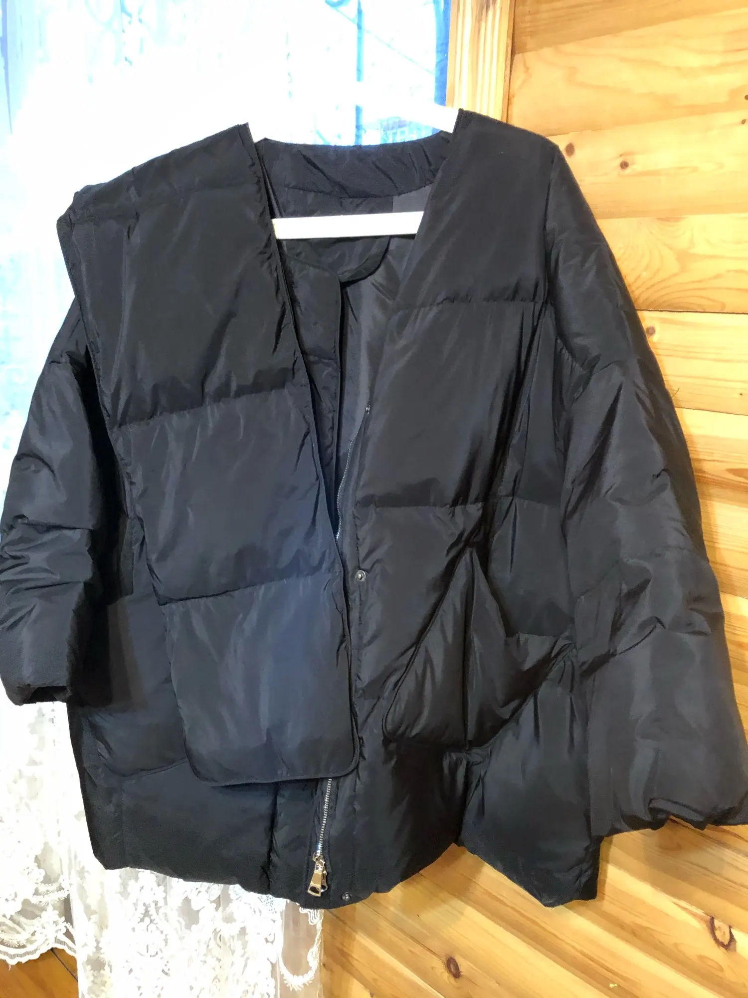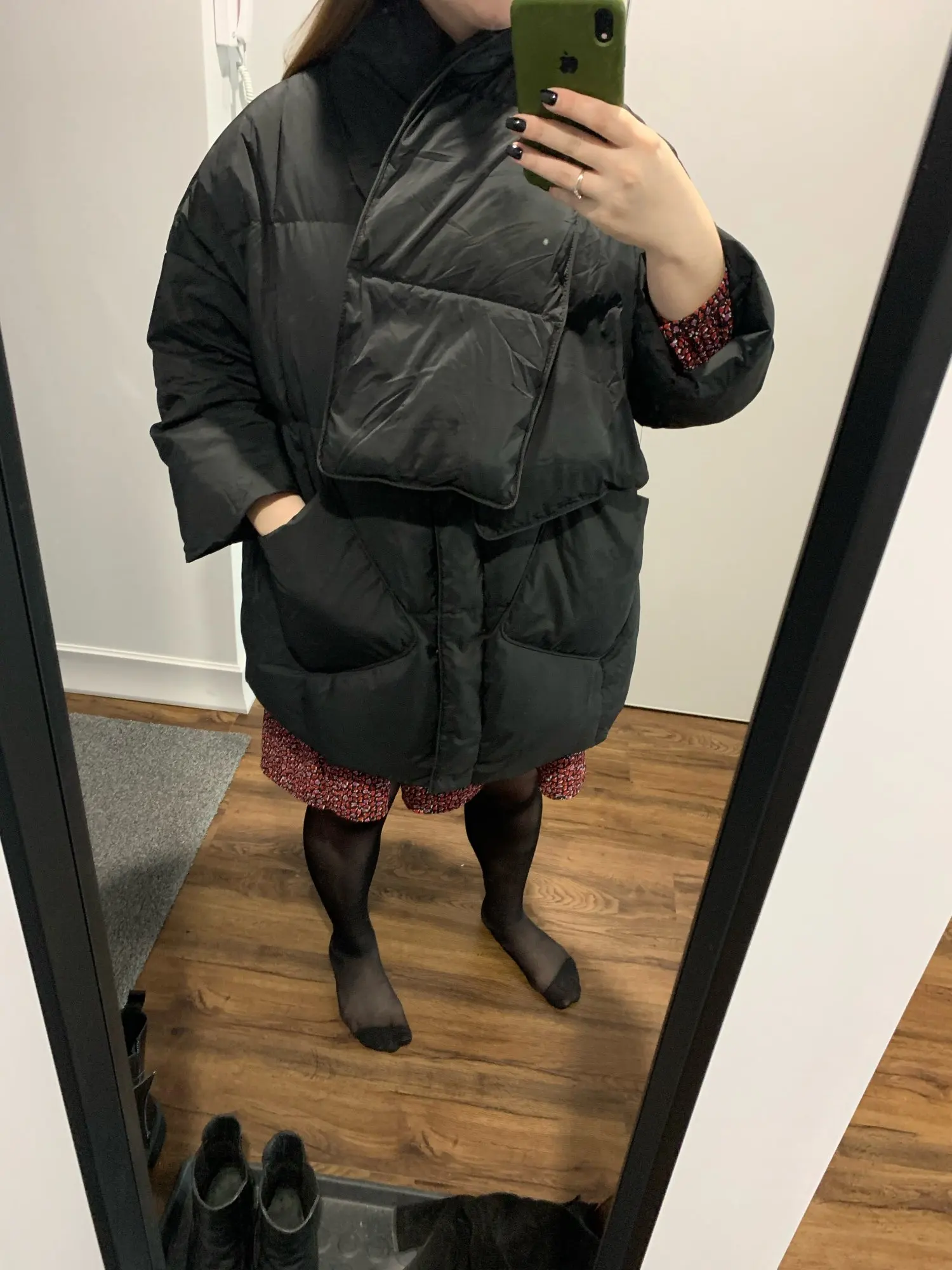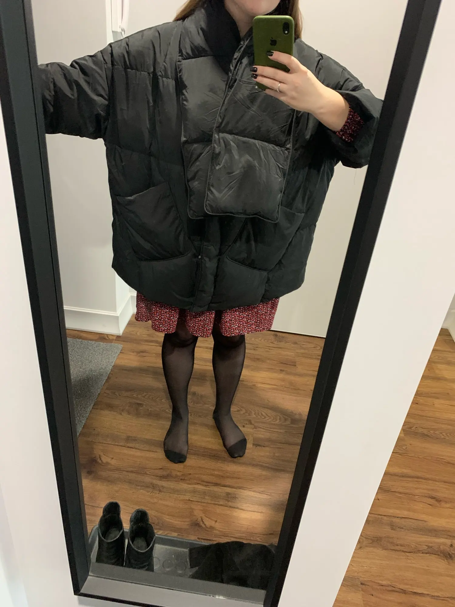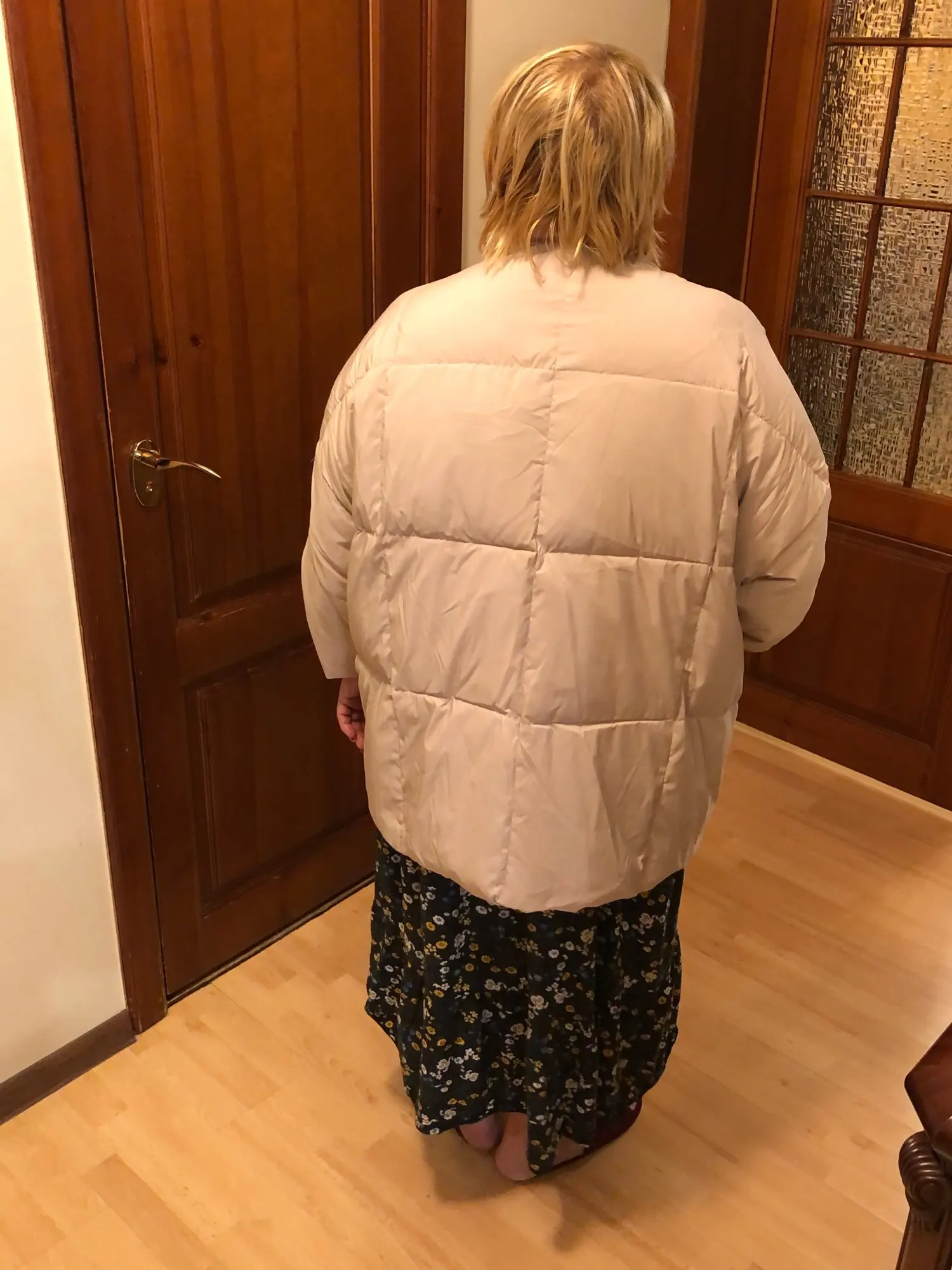 Очень довольна пуховичком. Пришлось неиного подождать. Заказала 11.11 получила 14.12. Качество пошива, ткань на высоте, но он до -5 градусов, не более. Фасон оверсайс, даже на мой 48 российский размер очень объемный, но в этом вся фишка. Такую одежду надо уметь носить!