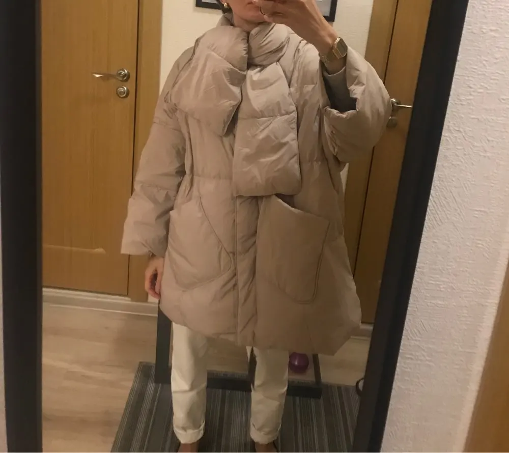 Куртка полностью соответсвует фото продавца. Брала размер S, на параметры 167, 95-75-105. Очень оверсайз. Дала маме примерить и эта куртка перекочевала в ее гардероб. Ей очень хорошо ( рост 162-164, размер 54). Есть кулиска внизу подола, можно утянуть , будет как кокон. Шарф отдельно, не крепится никак. Куртка тонкая, лёгкая, внутри пух-перо. На зиму наверное прохладная для Сибири, но до -5 -7 вполне подойдёт.