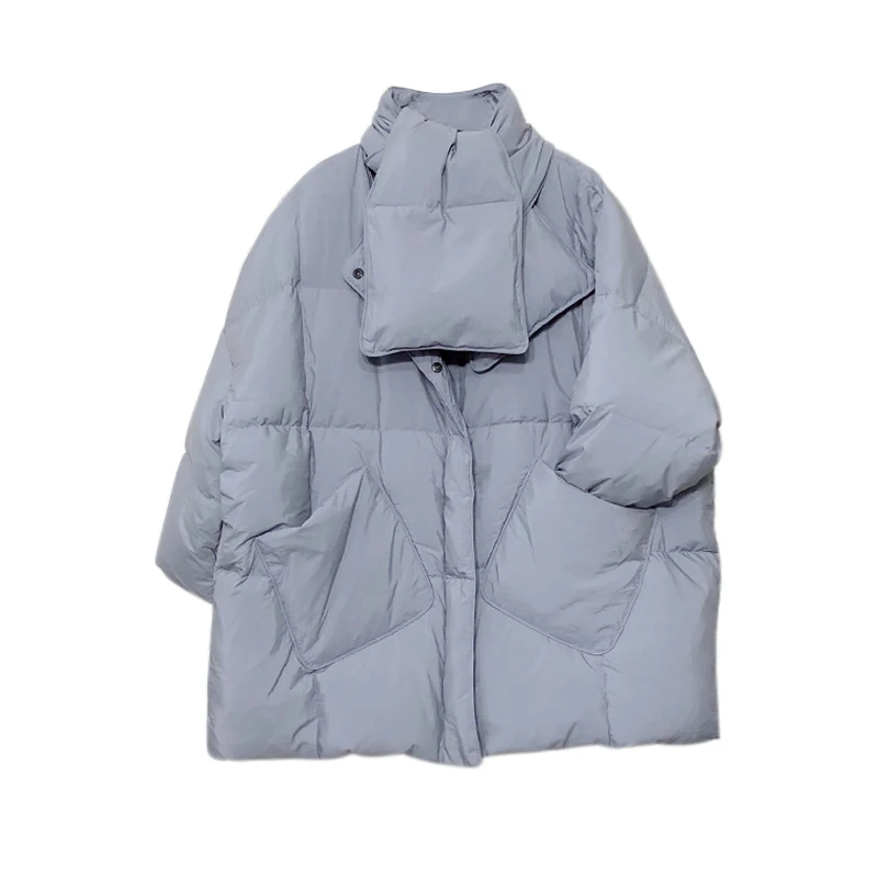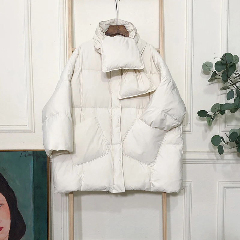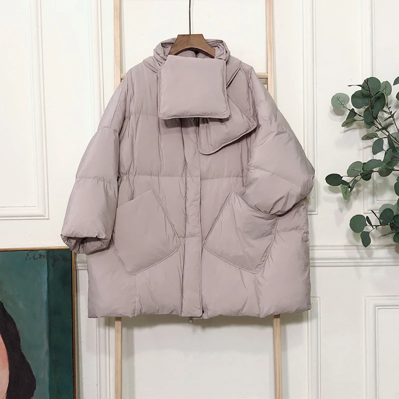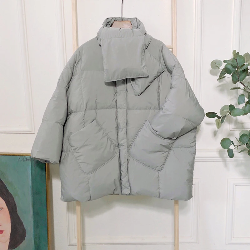 Куртка женская зимняя, однотонная, с шарфом, теплая, 2021 пуховик на белом утином пуху, свободная, оверсайз, длинная, 90%