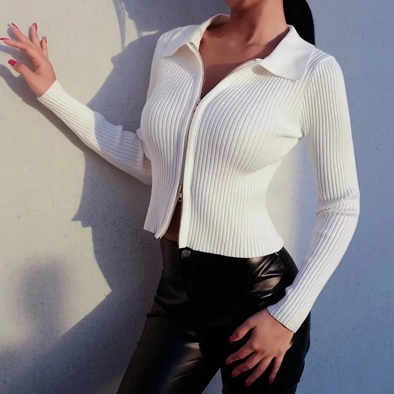 Женский трикотажный кардиган на молнии, короткий свитер с отложным воротником и длинными рукавами