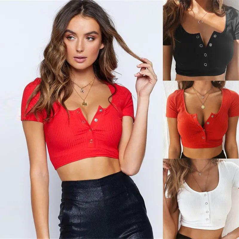 Женская майка с коротким рукавом, на пуговицах, с U-образным вырезом