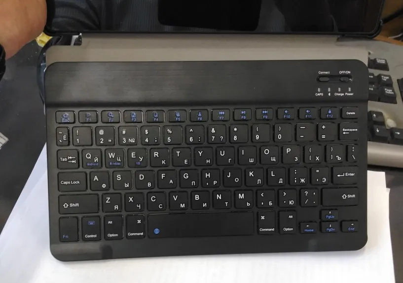 Клава хорошая, компактная, легкая, тонкая. Печатать удобно, язык переключить опции+пробел и подержать секунды 3. К samsung galaxy tab10 подключилась сразу же. Пришла заряженная, уже напечатала 2 отзыва на irecommends)