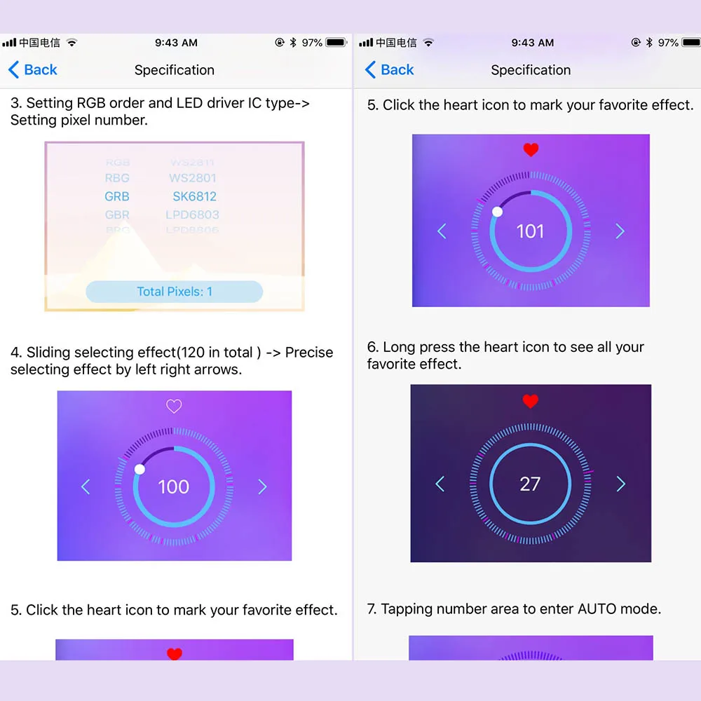 Поддержка настройки типов ИС, последовательности R/G/B и количества пикселей, управление всего до 1024 пикселей. Сохраняйте настройки пользователя при отключении питания. Постоянный ток 5 В ~ 12 В, широкое рабочее напряжение; Защита от обратного подключения; Защита от горячей замены.