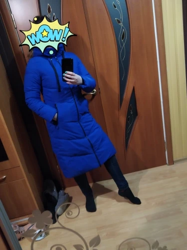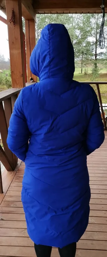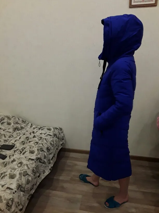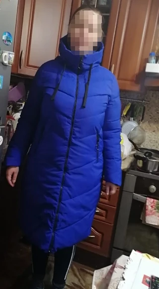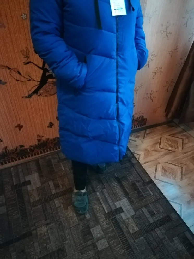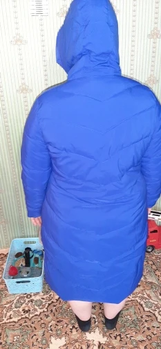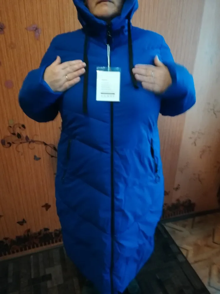 Все ОК! Пуховик действительно такой же ярко- синий, рукава нормальные, капюшон в норме. Брала себе на зиму ХХЛ, у меня 44-46, ОБ 98, ОГ до 90 см ,сидит отлично, чуть ниже колен.