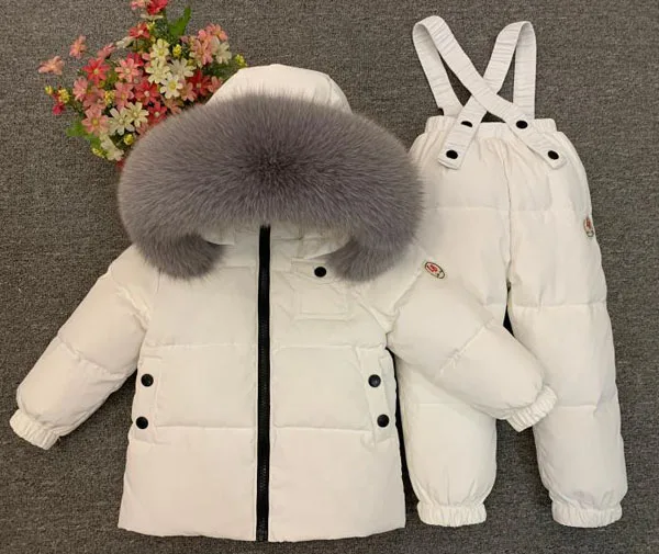 Детский зимний костюм Детский пуховик из 2 предметов Одежда для мальчиков и девочек плотные лыжные курткиВоротник из натурального меха серого песца, очень большой и модный.Наполнитель: белый утиный пух. Подходит для-30 градусовТкань ветрозащитная и снегозащитная.Носить можно как мальчики, так и девочки.
