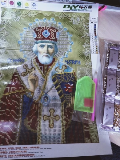 Заказом осталась очень довольна! Дошел до Санкт-Петербурга за 3 недели с момента заказа. Немного помялось полотно т. к. не было намотано на валик, но не критично. Стразы блестящие, прозрачные, не матовые. Заполнение вышивки не полное, лицо, руки и ореол не выкладываются.