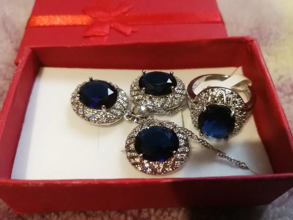 увидела такой комплект за 30 000 в пассаже, влюбилась. продавец объяснила, что китайское серебро, натуральный сапфир. вот я удивилась обнаружив такой комплект случайно на али. продавца рекомендую, шло 1 месяц, упаковано аккуратно, в подарочную коробку. покупкой довольна, размер кольца совпадает. ставлю отлично!!!