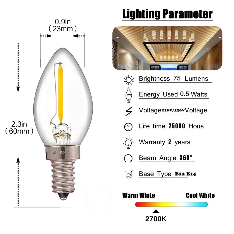 Светодиодная лампа Эдисона C7, лампа-свеча, хрустальная лампа E1214, с маленьким отверстием под винт, теплый белый, теплый желтый, ночник, источник светильник