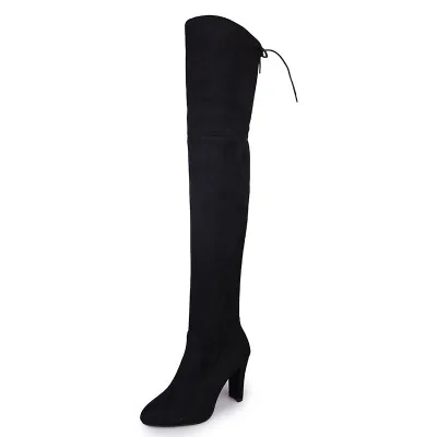 Женские сапоги выше колена из флока, на шнуровке, на высоком каблук...