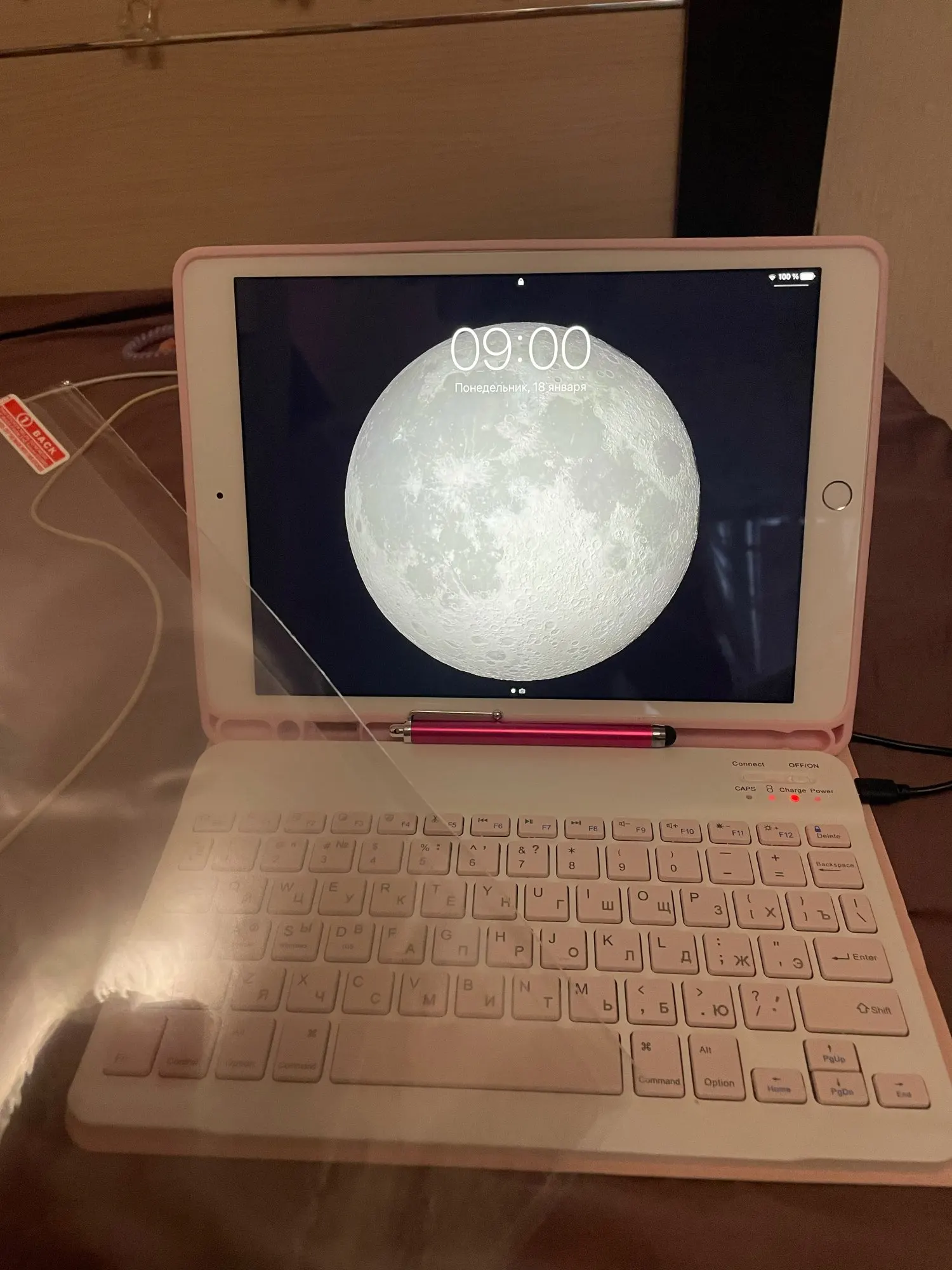 В комплект продавец доложил плёнку и стилус, единственное у меня уже была наклеено стекло и когда вставил в чехол то стекло с одного края приподнялось, но это не страшно. Клавиатура отлично работает с iPad 8 2020 WiFi + Cellular.