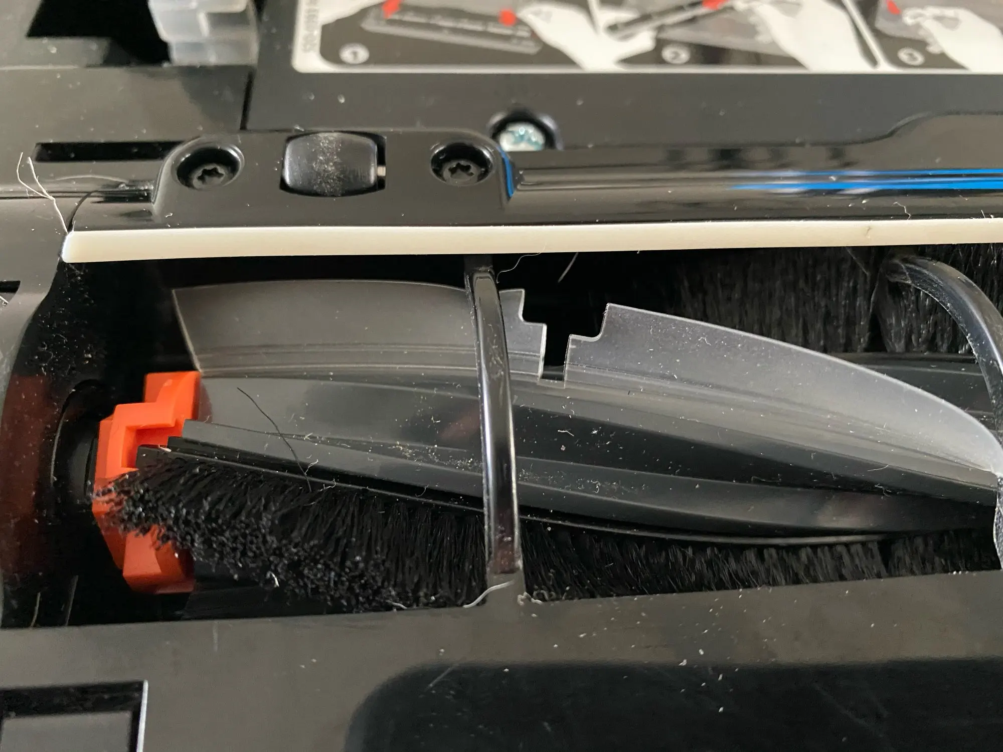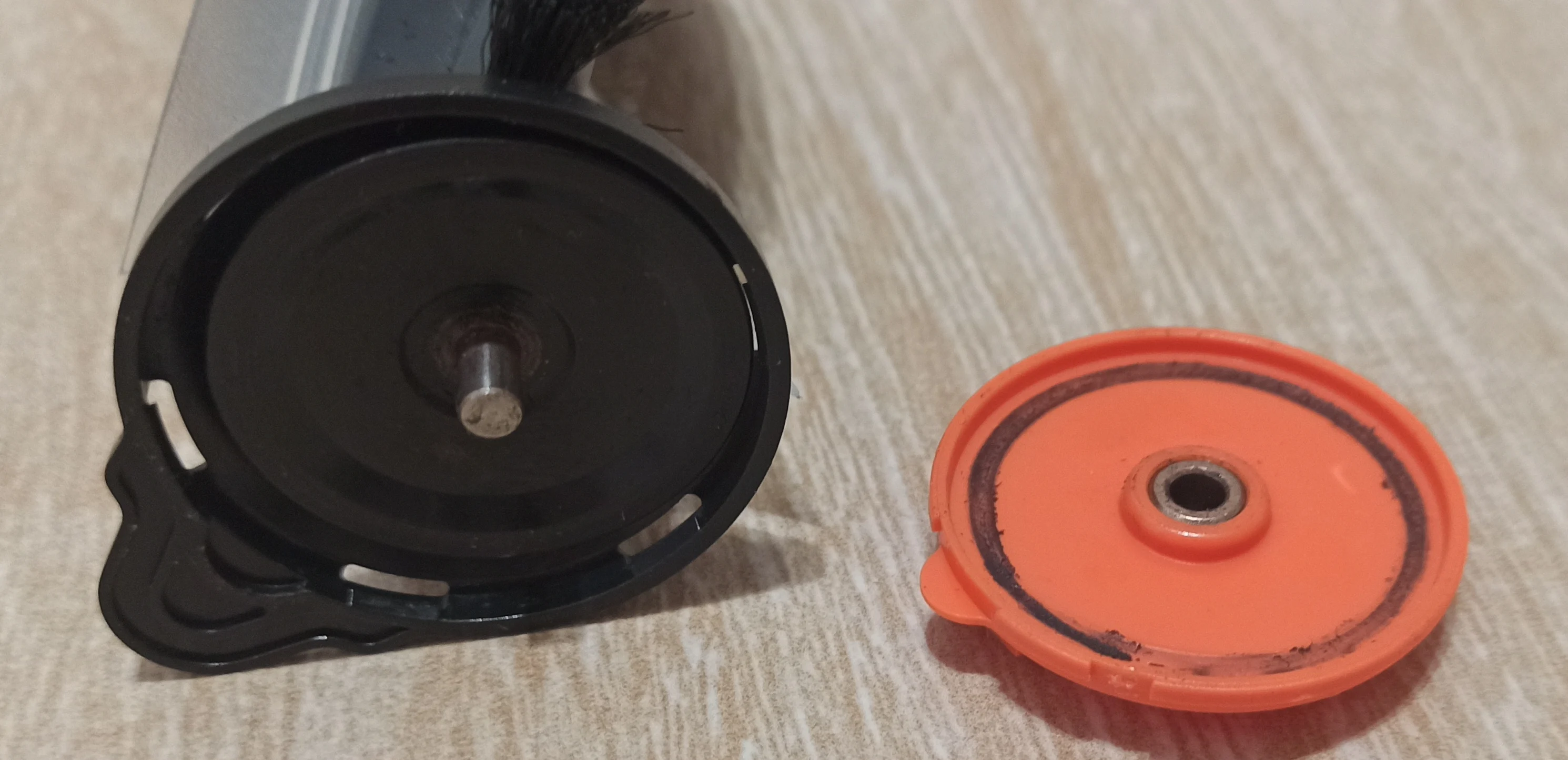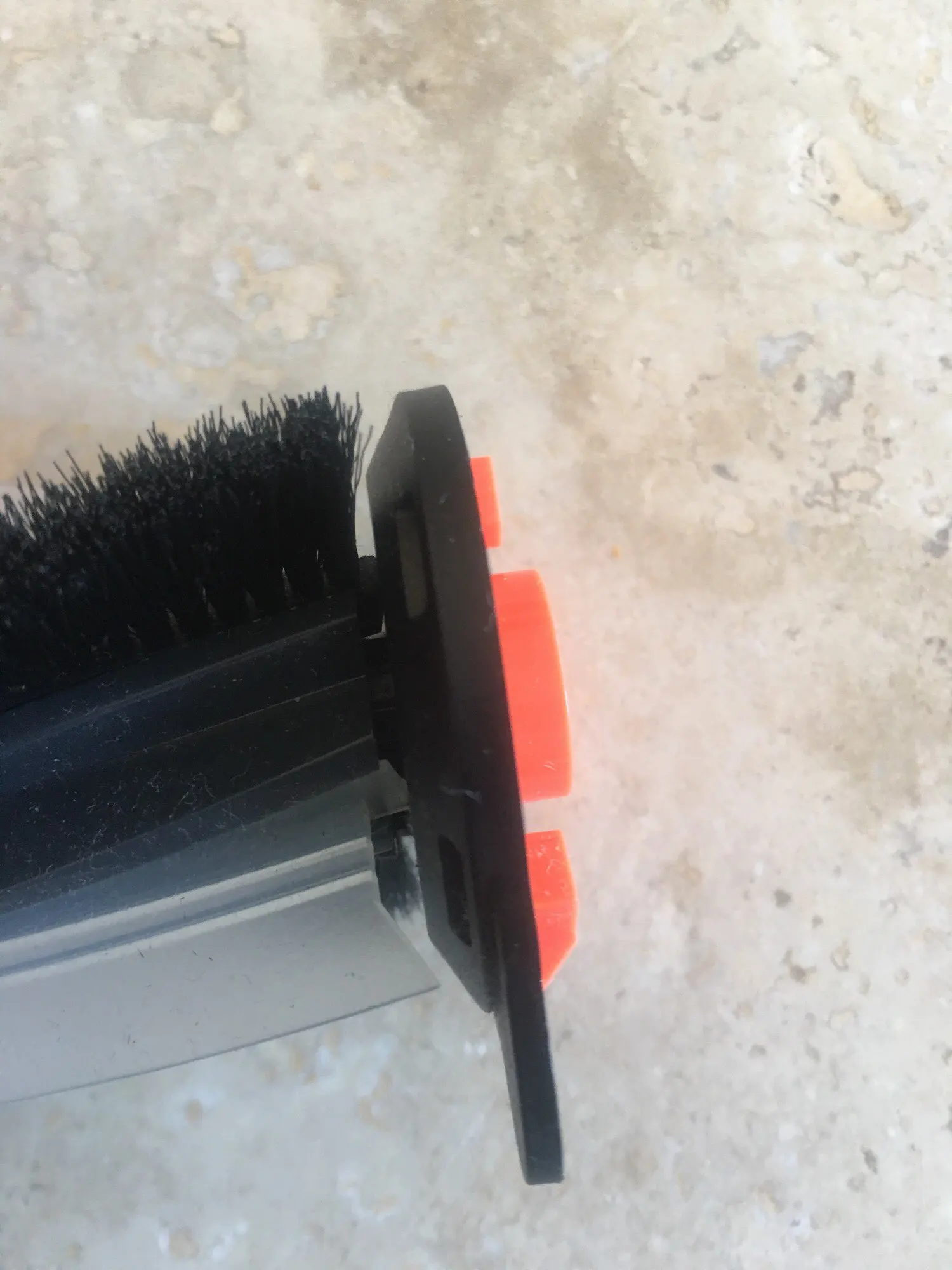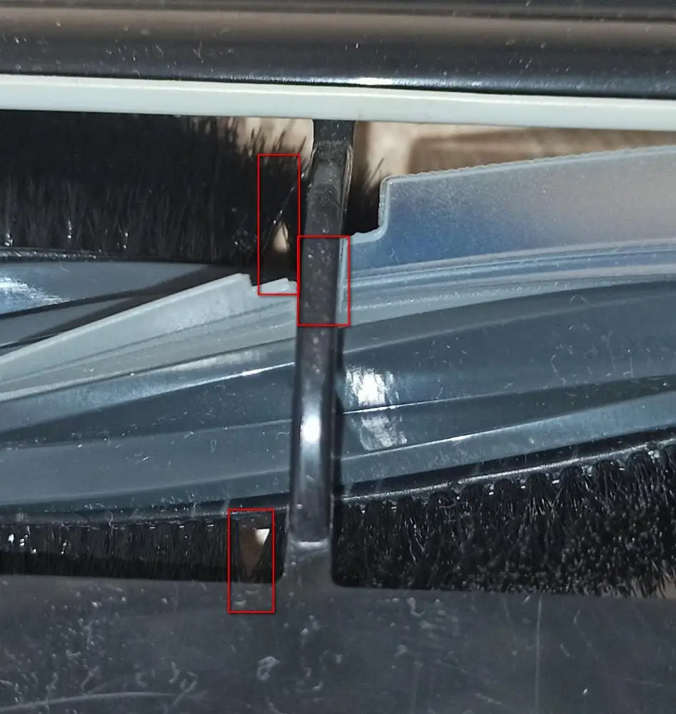 Щетка запахла пластиком после трех минут работы. Локальная уборка и щетка не работает!!! Защитная крышка терлась о крышку с втулкой (фото 1). Половина отверстий в силиконовой части не совпадает с выступами пылесоса (фото 2,3). Даже прорези в щетине не совпадают с прорезями в силиконовой части (фото 4). Поэтому при работе силикон просто натирал корпус пылесоса.