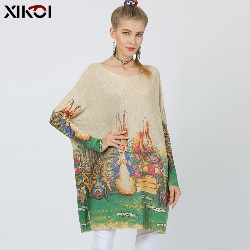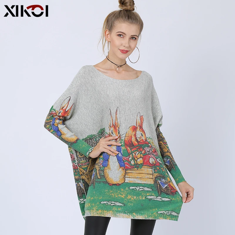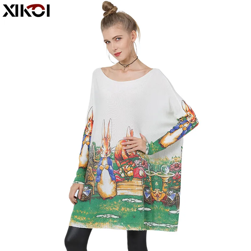 Женское трикотажное платье-свитер XIKOI с изображением милого кролика, зимние теплые шерстяные пуловеры с воротником-лодочкой, женский джемпер с животным принтом, новинка