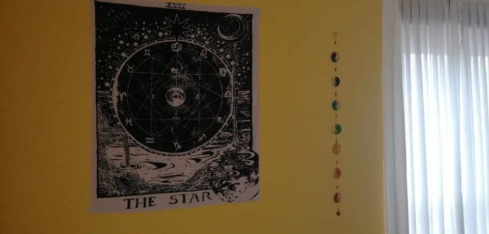 Поставляется с держателями, но, к сожалению, они бесполезны, так как не могут нести вес гобелена. Я использовал простую ленту 3M. Качество отличное, так же цена, но мне потребовалась пара недель, чтобы привыкнуть к черту. Я не думаю, что это был правильный выбор, поэтому я принёс волшебника в полный цвет, чтобы заменить его. :)