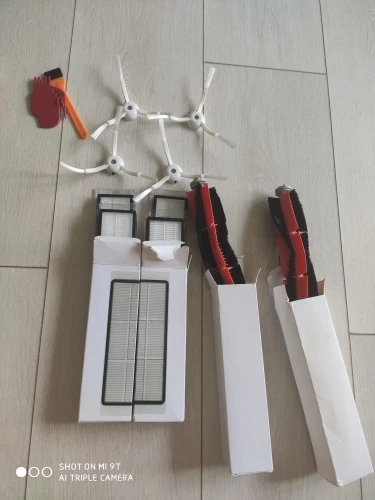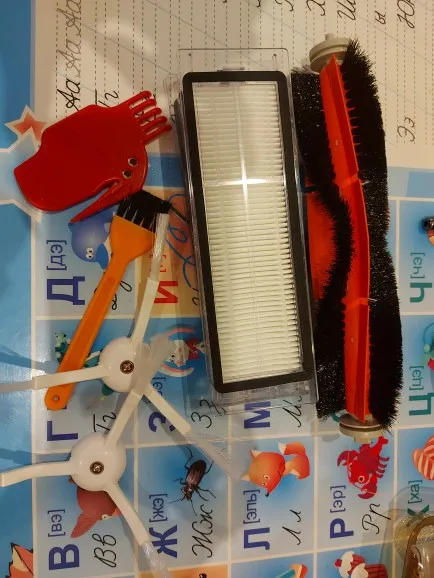 Отличная замена оригинального комплекта. Сравнил боковую щётку с оригинальной - в оригинале, ворсинки прошиты ниткой у основания и более мягкие лучи, но в замене щетки более пушистые. Основная щётка тоже понравилась, единственно по краям странный пластик на ощупь, как у вторичного сорта пластика (поскольку это расходних - вопросов нет), главное чтобы крепления не сломались :) По воздушному фильтру отпишусь позже, как он переживёт мойку.