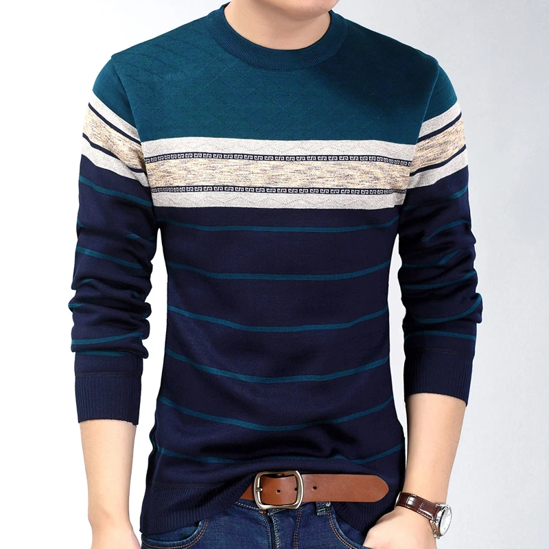Мужской Хлопковый трикотажный свитер в полоску, с круглым вырезом