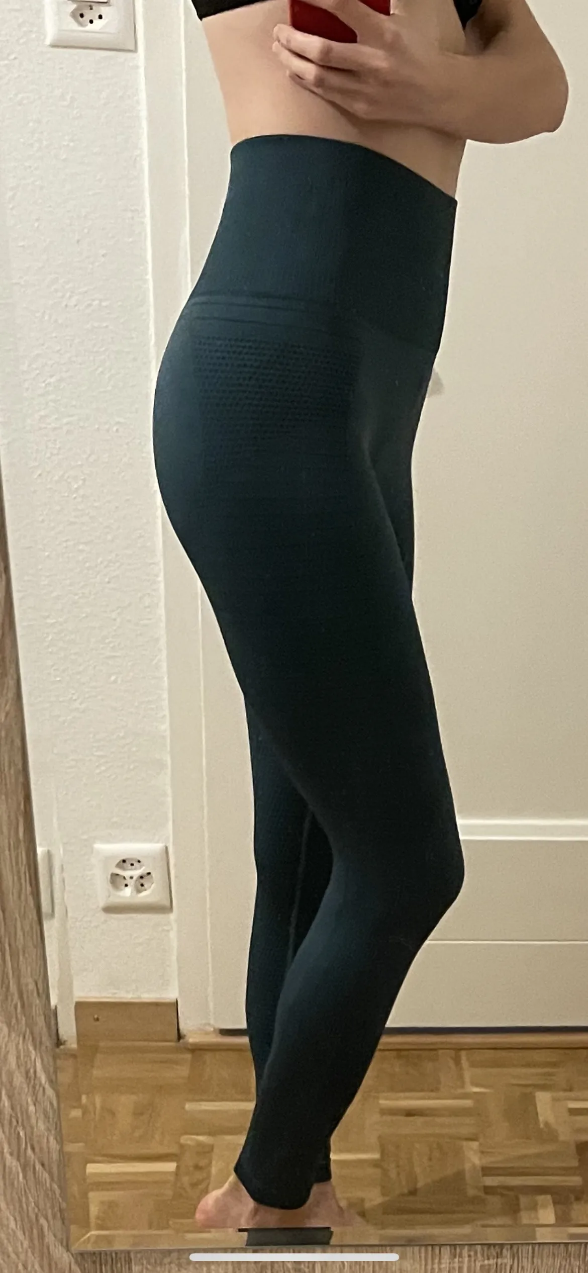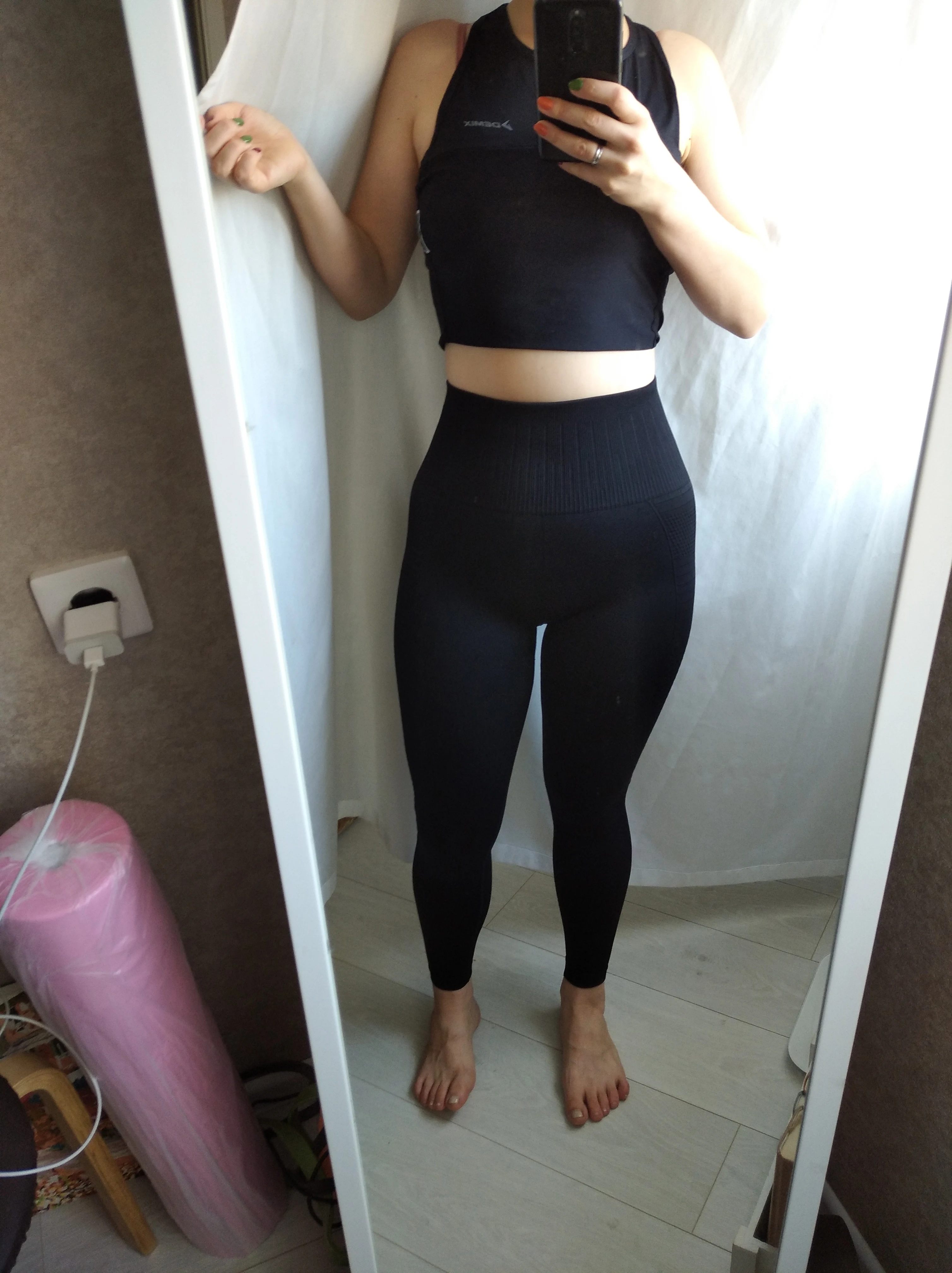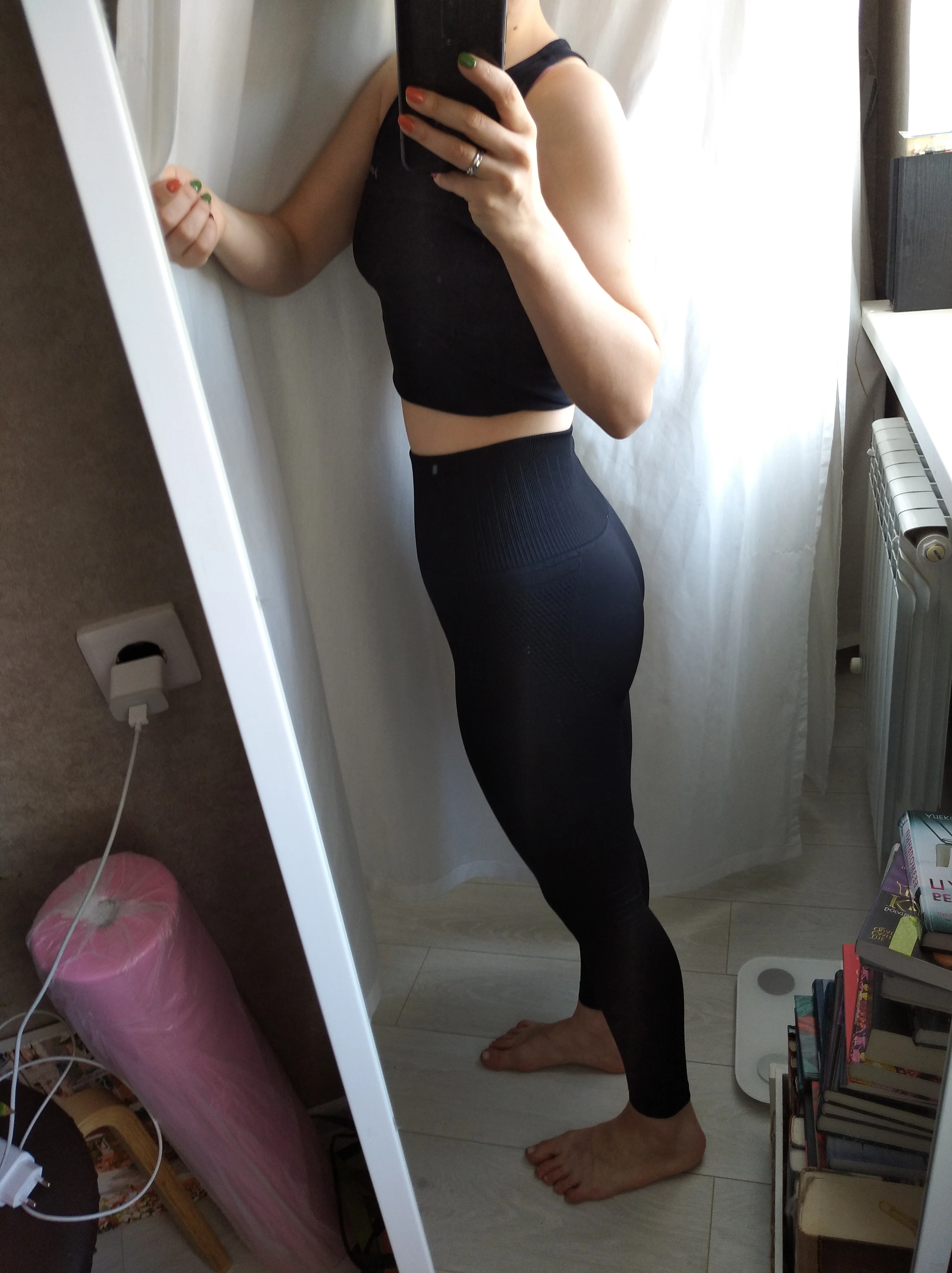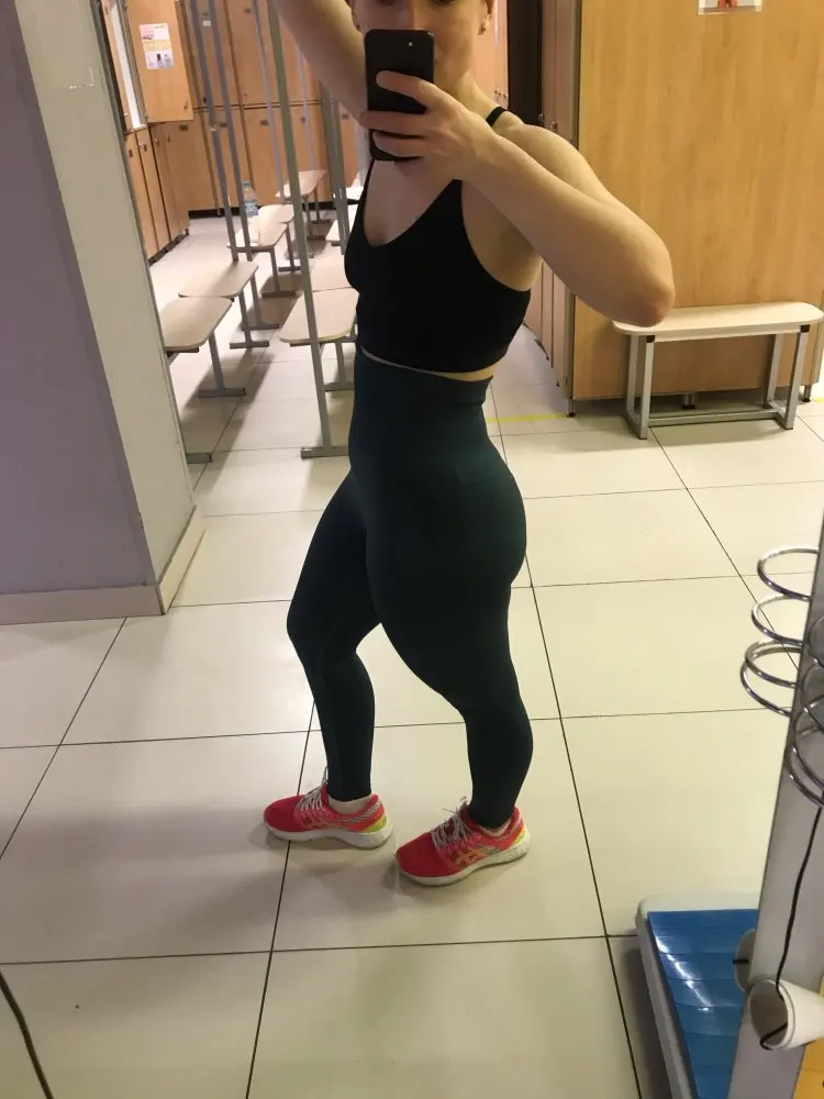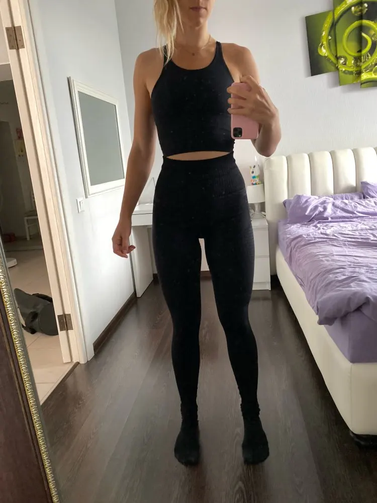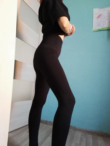 Немного расстроена, думала будет супер утяжка, а получилось в талии вообще свободно. По размеру советовалась с продавцом, он посоветовал брать L, от-68, об-96, в ногах плотненько сидит, но все равно не так уж прям и утягивает, талия-свободно, надо было брать M скорее всего, но зато приседать можно не боясь, что все треснет. Легги имеют фактурный рисунок, вроде удобные, ещё не занималась