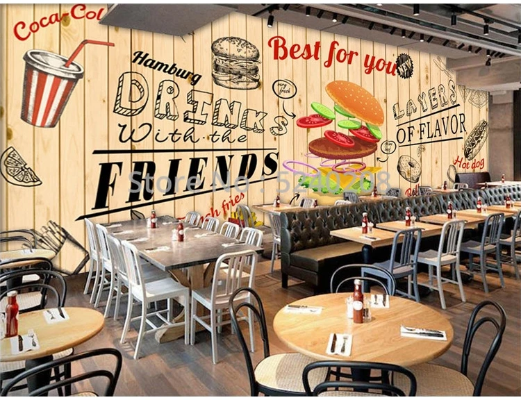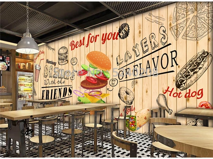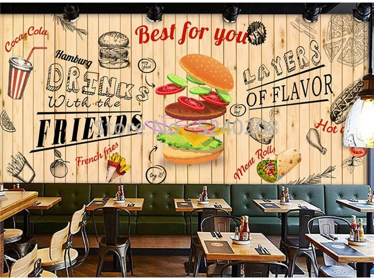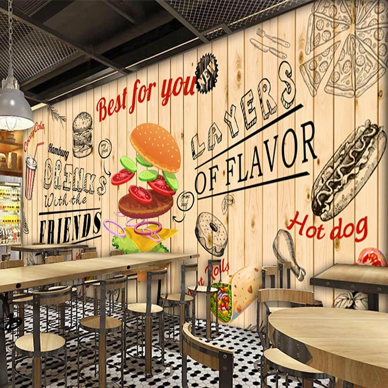 Пользовательские Настенные обои 3D Ручная роспись Гамбурга быстрого питания Ресторан снэк-бар Настенная Наклейка 3D самоклеющиеся водонепроницаемые фрески