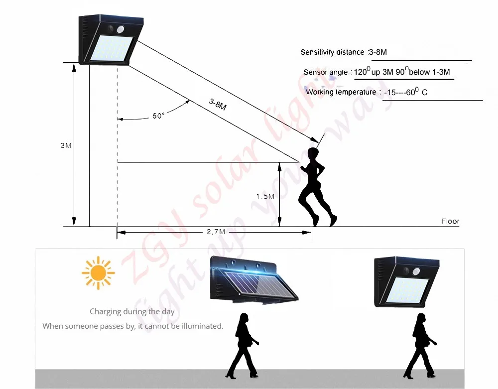 Он автоматически включит тусклый светильник ночью, когда люди приближаются около 3-5 м, он включит яркий светильник в течение 20-25 с, а затем автоматически поворачивает тусклый светильник.