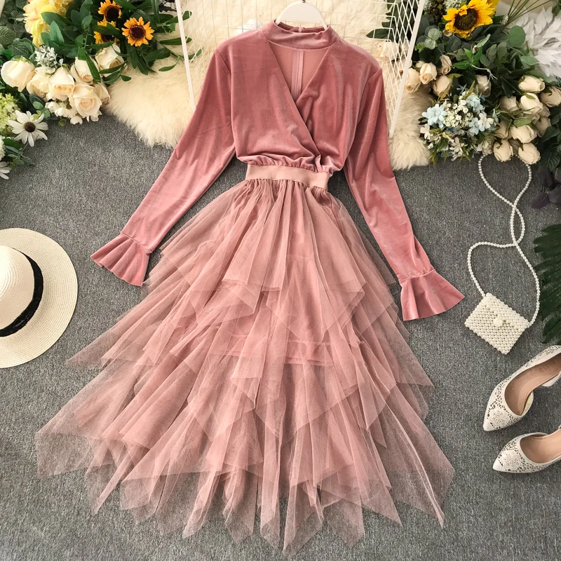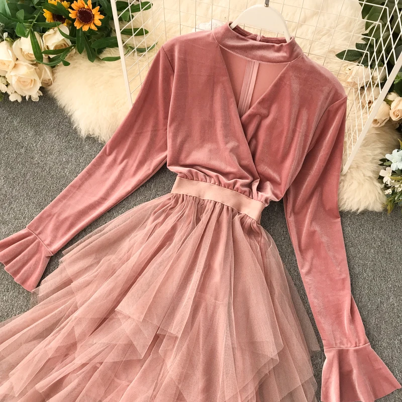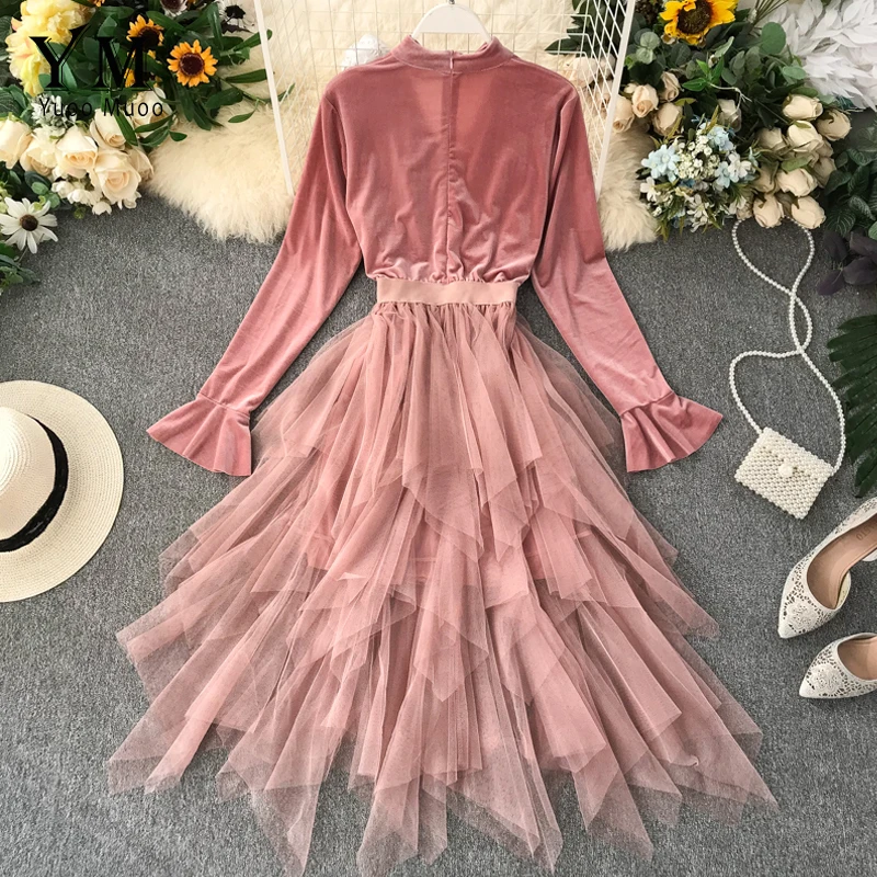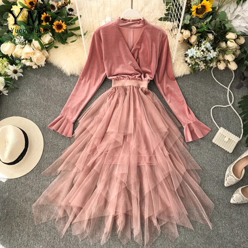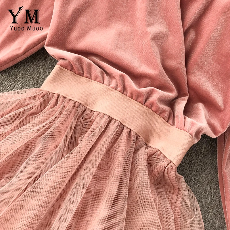 YuooMuoo, хорошее качество, удобное романтичное женское розовое вечернее платье, сезон осень-зима 2019, длинное бархатное платье с V-образным вырезом и асимметричным кружевом