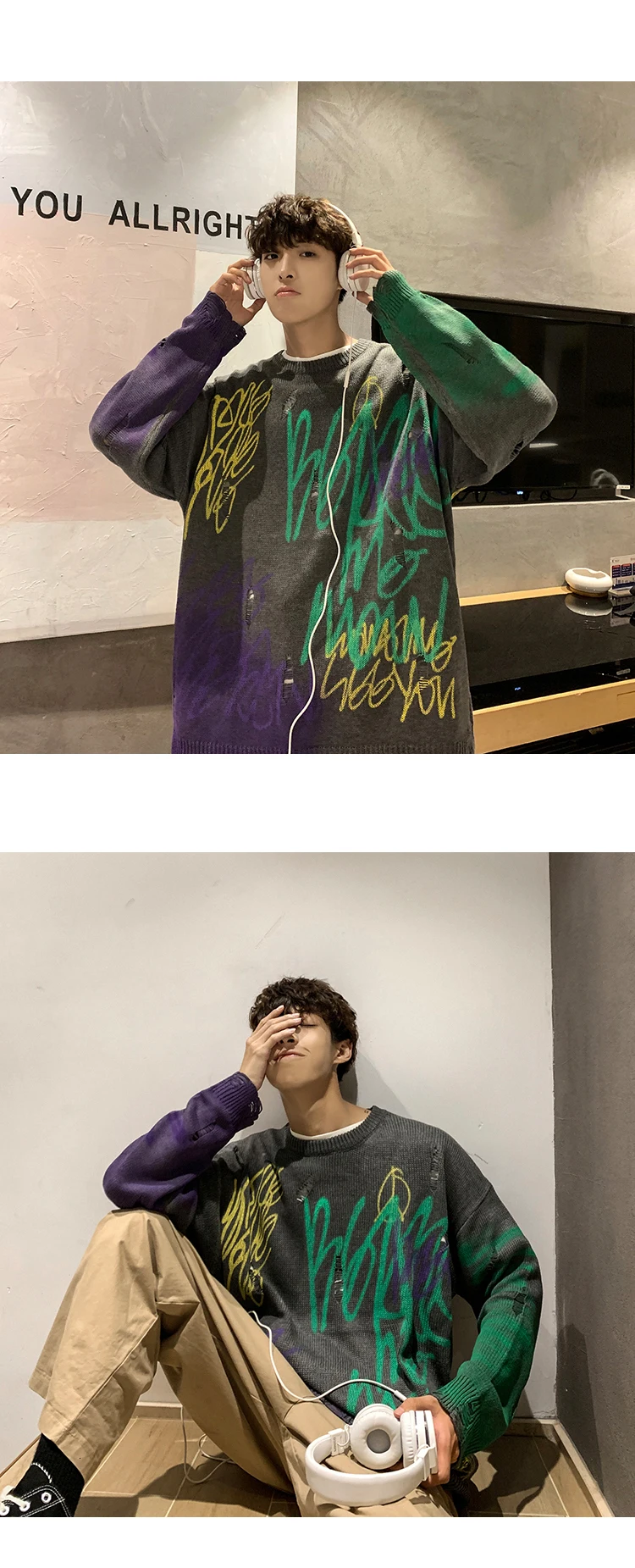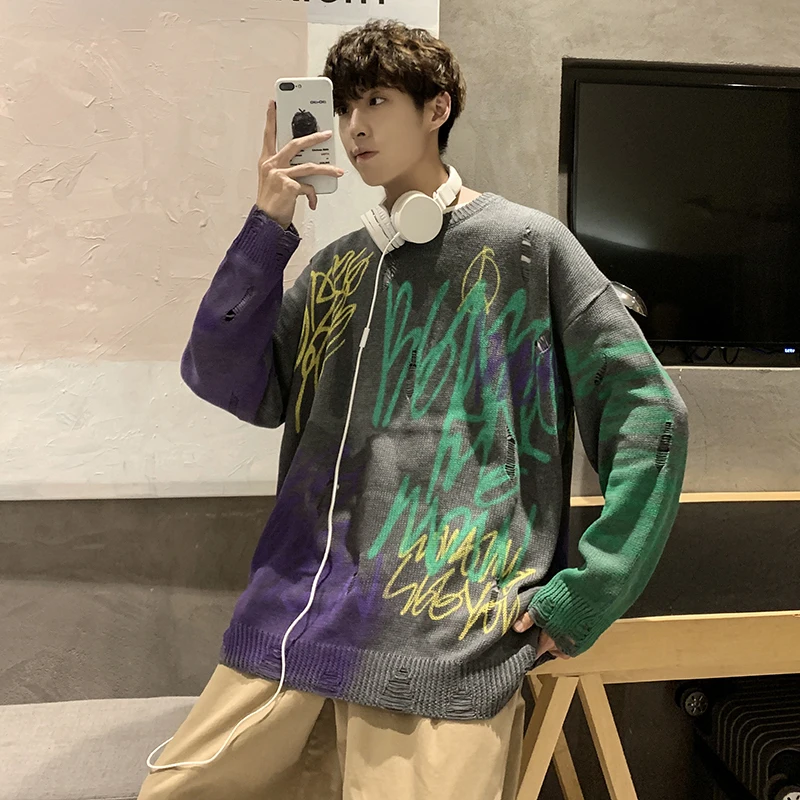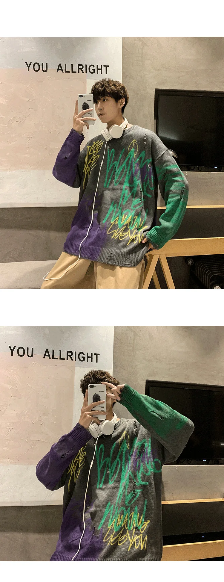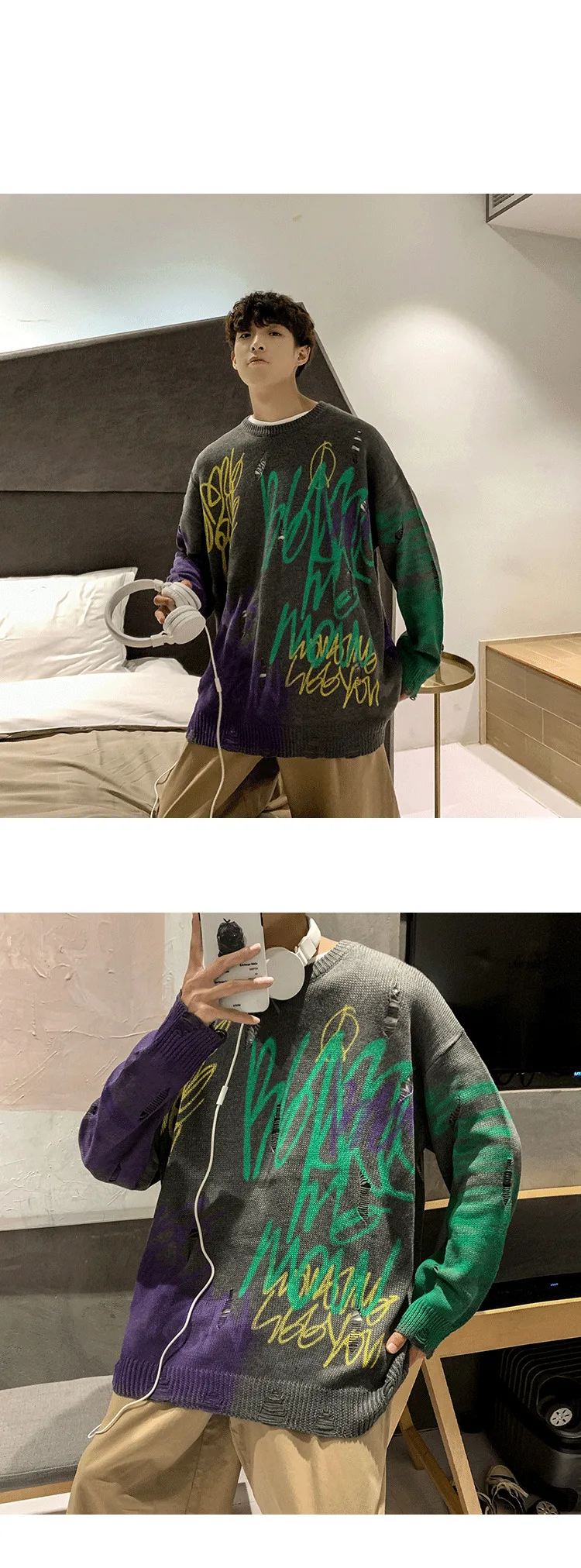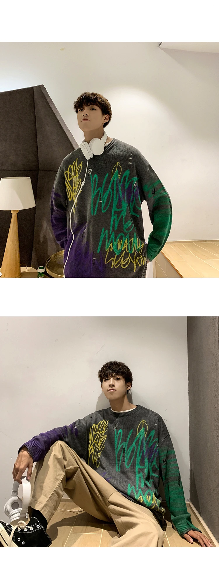 2019 зимние мужские каракули пальто с принтом шерстяной кашемир свитера Повседневный пуловер отверстия Длинный Рукав Круглый Вырез Вязание knitting