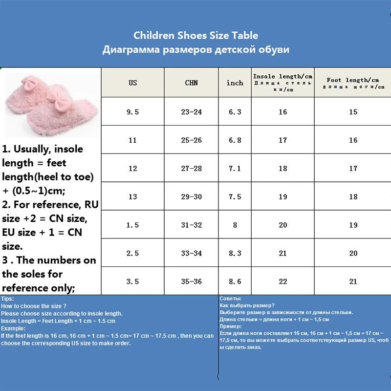 2. Пожалуйста, измерьте длину ступни вашего ребенка, см. Таблицу размеров, а затем выберите обувь для вашего ребенка.