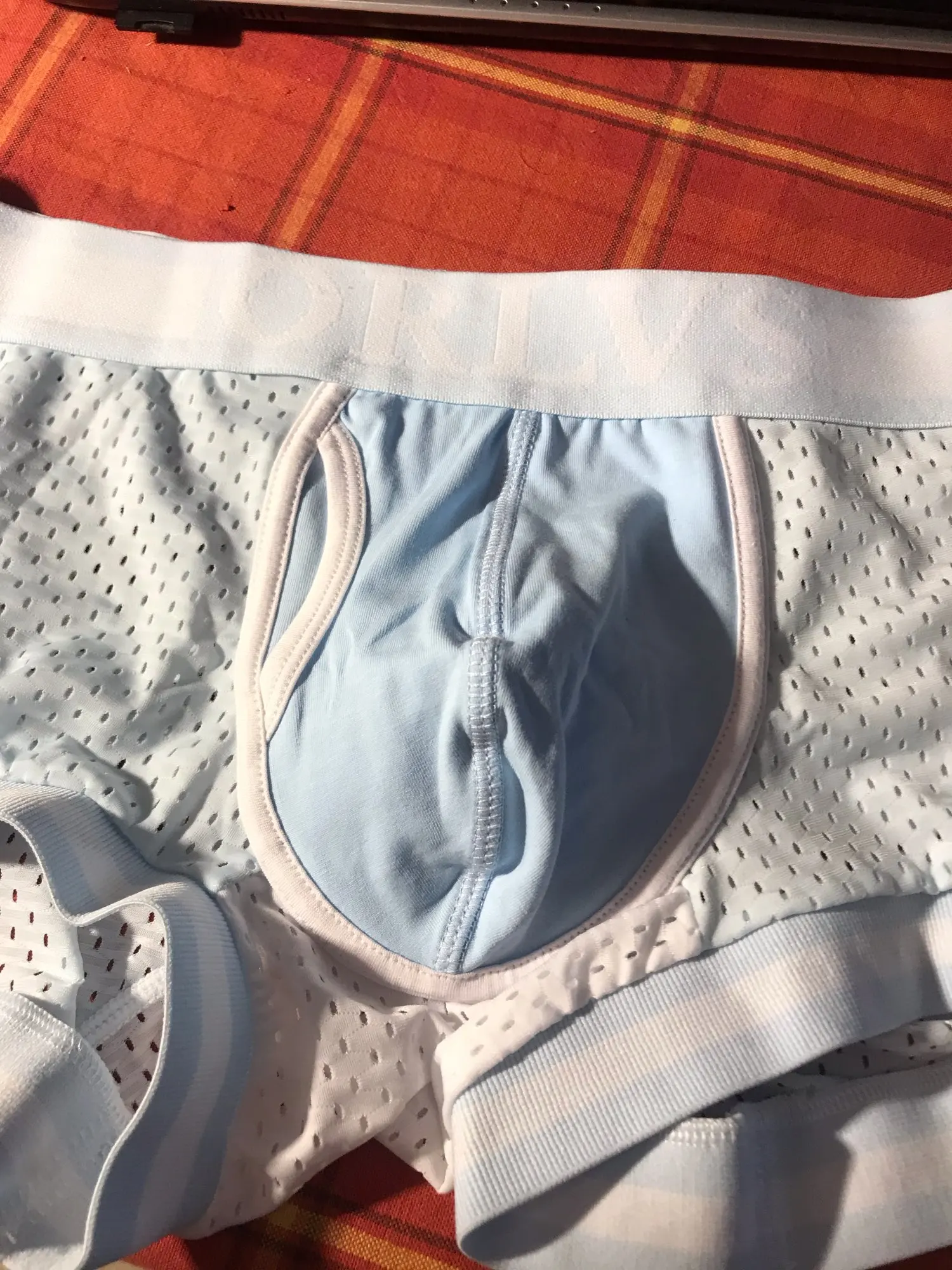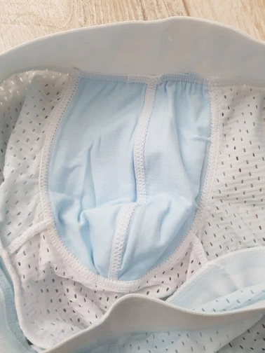 Бело-голубые оооочень красивые трусики. Размер М сели на 14 летнего сына хорошо, но из-за резинки по ногам думаю будут садиться не на всех, на его худые ножки резинки только только для комфортного ношения. По хозяйству:) вмещают много:)