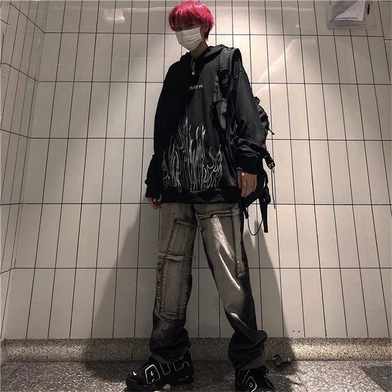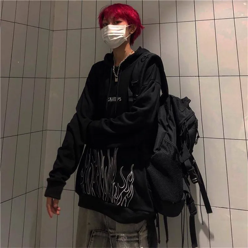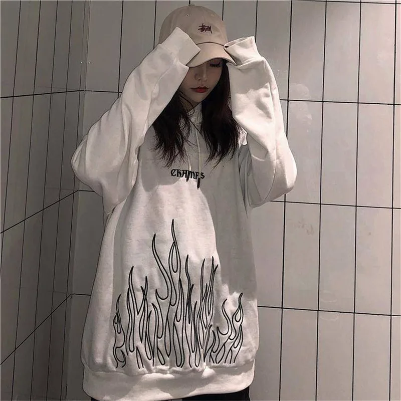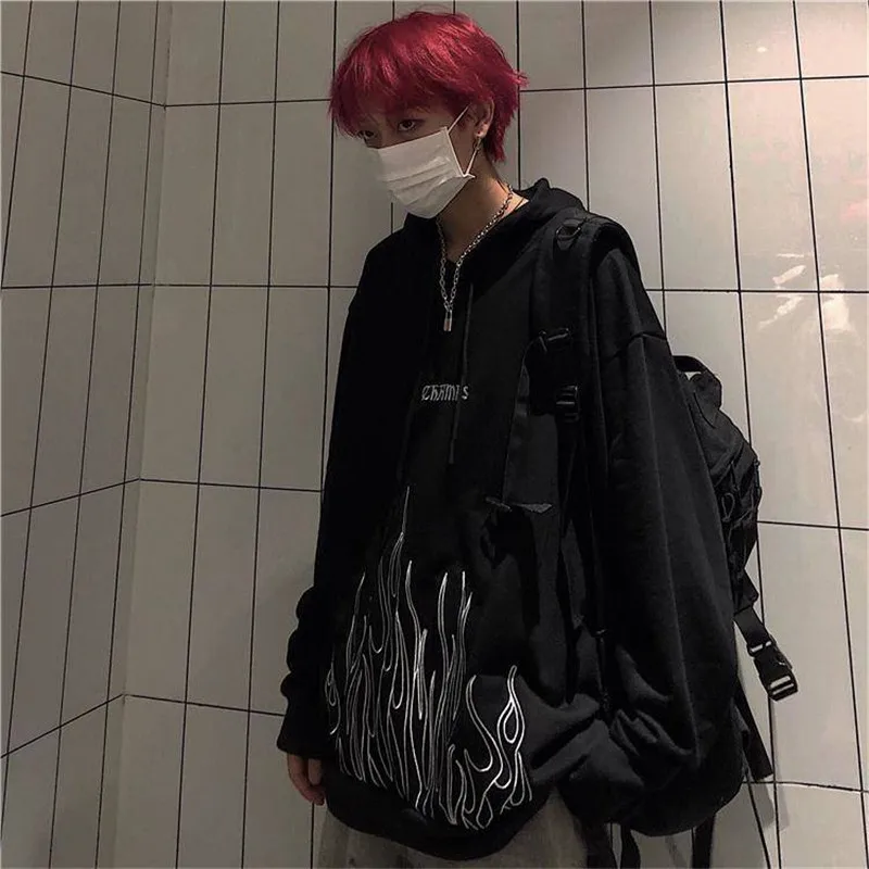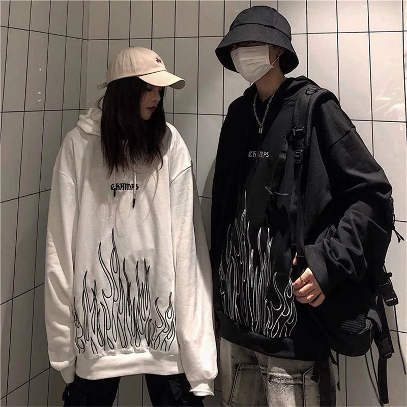 Черные осенние толстовки с принтом огня, женские повседневные свободные толстовки в стиле хип-хоп, женские корейские уличные толстовки в стиле Харадзюку для мужчин и женщин